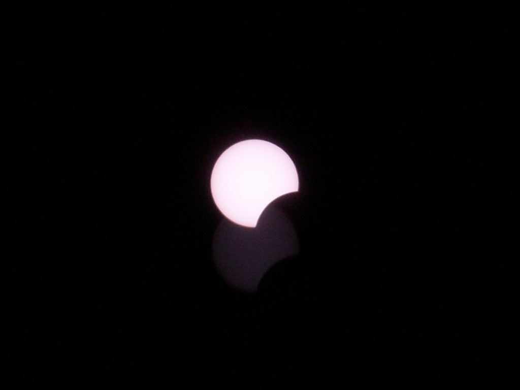 Am Restaurant erwischten uns die ersten Schatten der Wolken und ließen die Sorge wieder anwachsen. Je länger wir fuhren, umso besser wurde die Stimmung, denn die Wolken schienen zurückzubleiben. Kaum 10 Minuten vor eins konnten wir den ersten Kontakt beobachten. Und um 12:54 Uhr ergatterte ich das erste Bild mit meiner Digitalkamera durch das Busfenster.