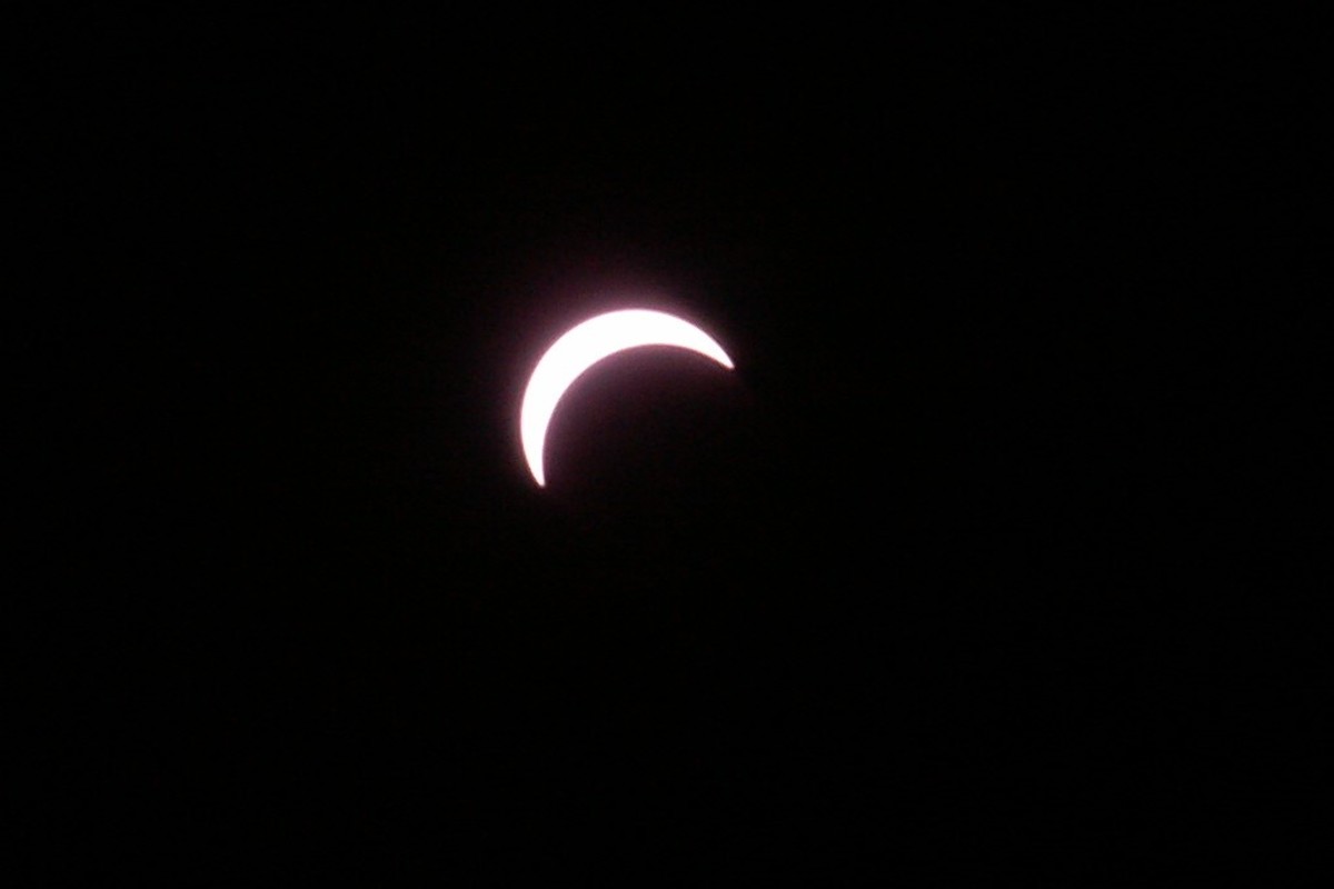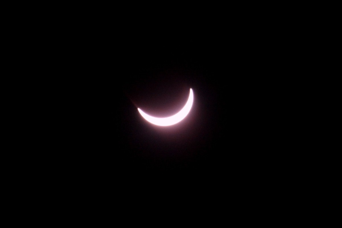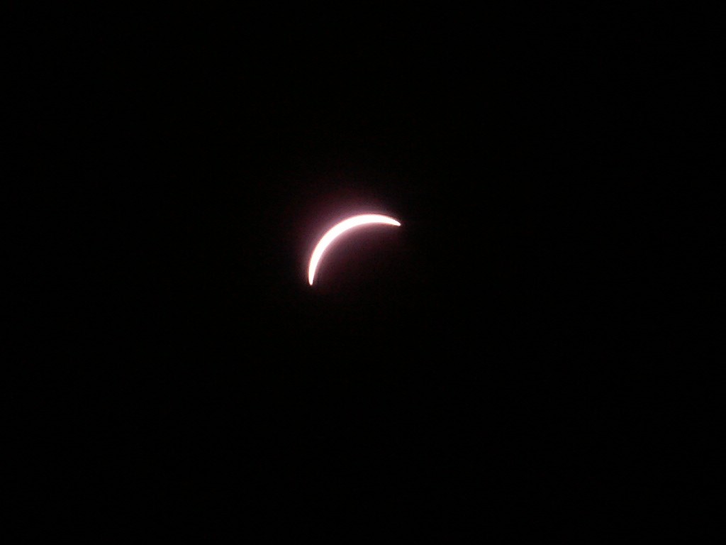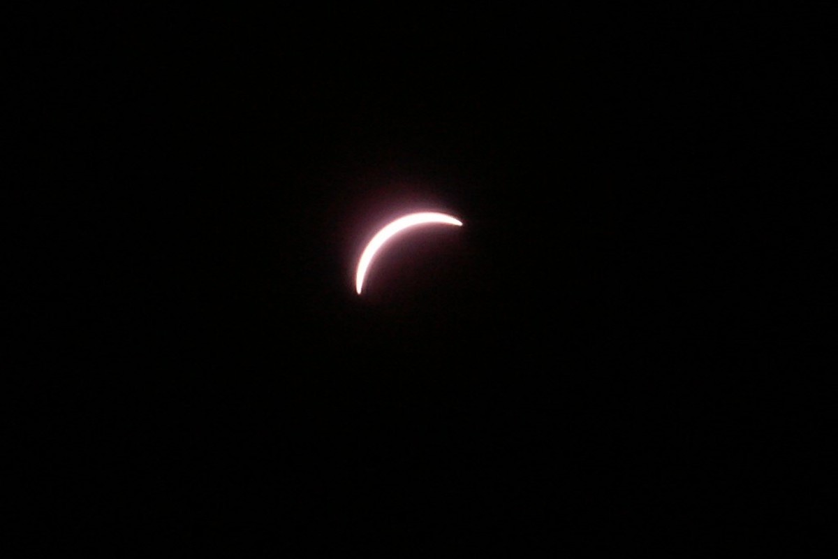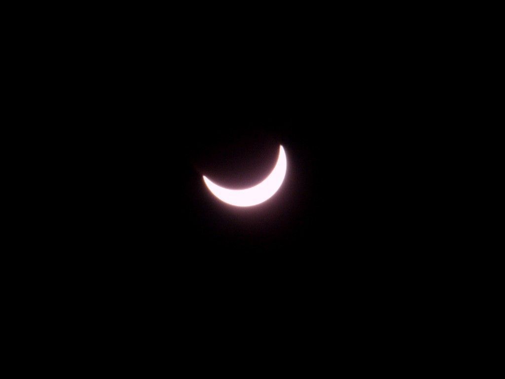 "Bereithalten, die Filter abzunehmen" - ich nahm sie gleich ab, es wird den Fotoapparaten nicht schaden. Es ist nochmal dunkler geworden, und man konnte die LCD-Anzeigen auf den Kameras nicht mehr erkennen. Ich blickte hoch - wie sieht sie aus? Es ist immer noch eine kleine Sichel (auch dies sah ich 1999 schon, bevor sich die Regenwolke davorschob), und da schiebt sich die Mondscheibe tatsächlich vollständig vor die Sonne!