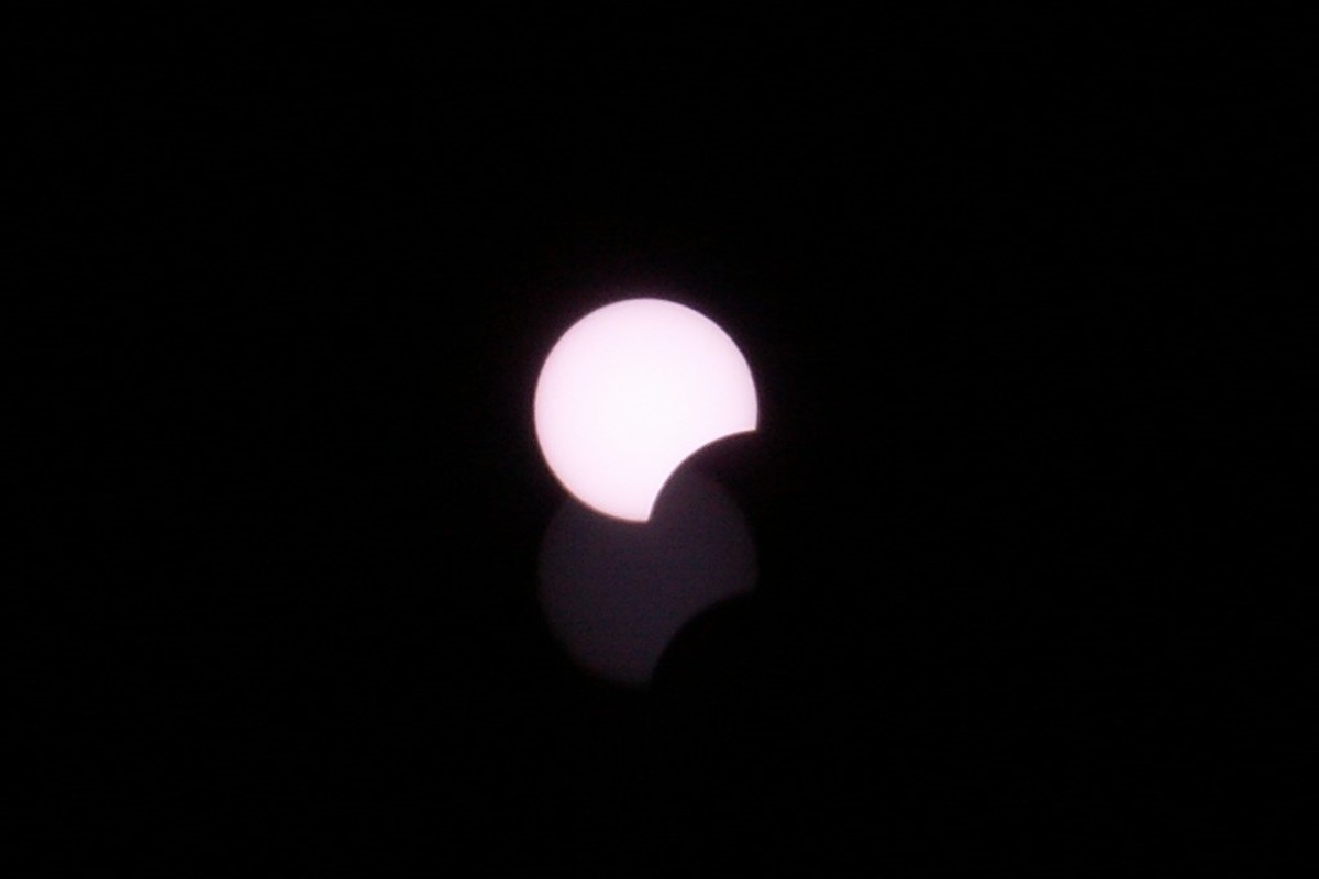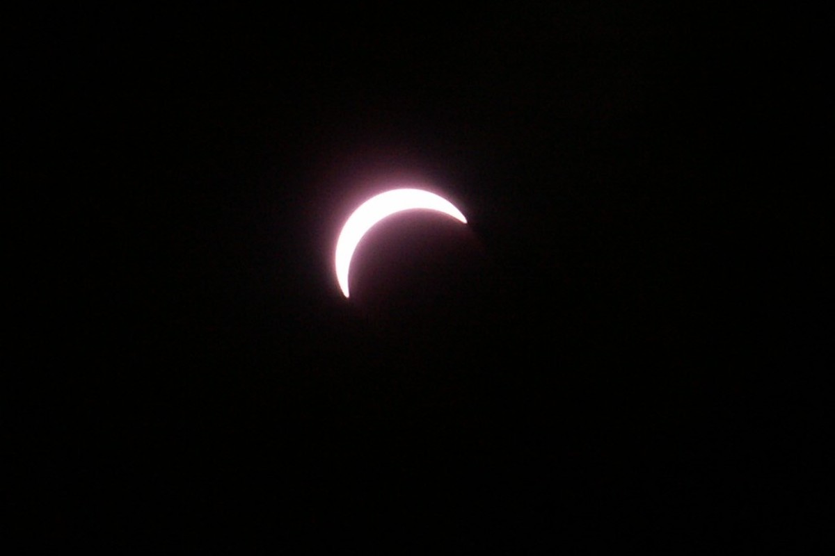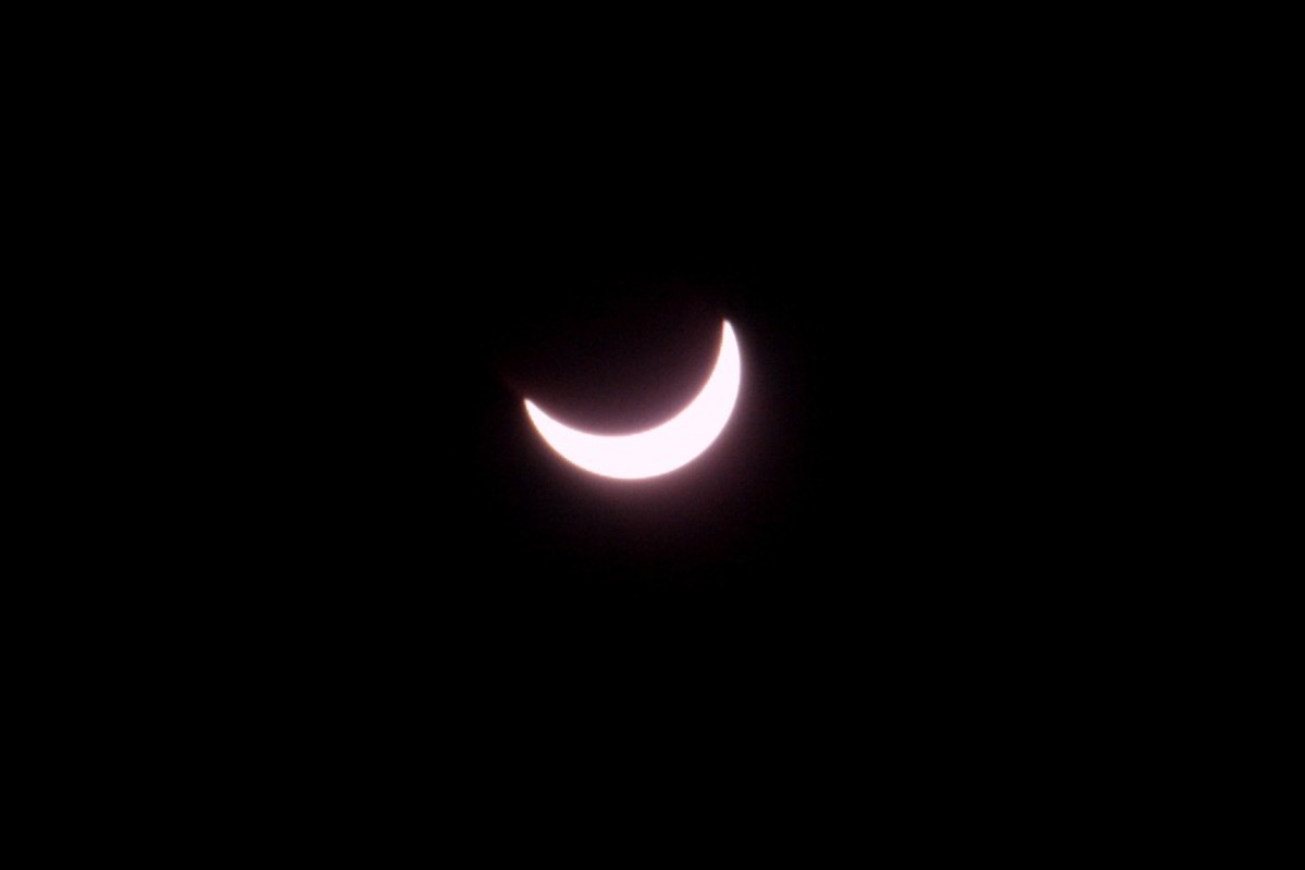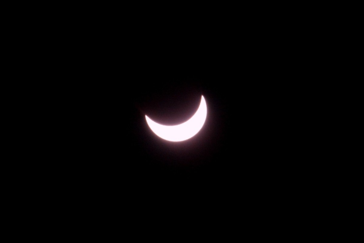 "Bereithalten, die Filter abzunehmen" - ich nahm sie gleich ab, es wird den Fotoapparaten nicht schaden. Es ist nochmal dunkler geworden, und man konnte die LCD-Anzeigen auf den Kameras nicht mehr erkennen. Ich blickte hoch - wie sieht sie aus? Es ist immer noch eine kleine Sichel (auch dies sah ich 1999 schon, bevor sich die Regenwolke davorschob), und da schiebt sich die Mondscheibe tatsächlich vollständig vor die Sonne!