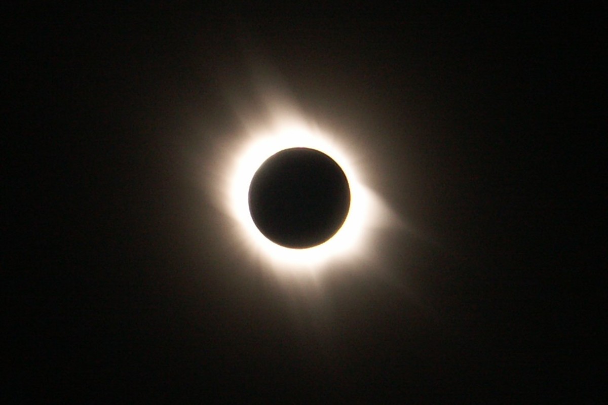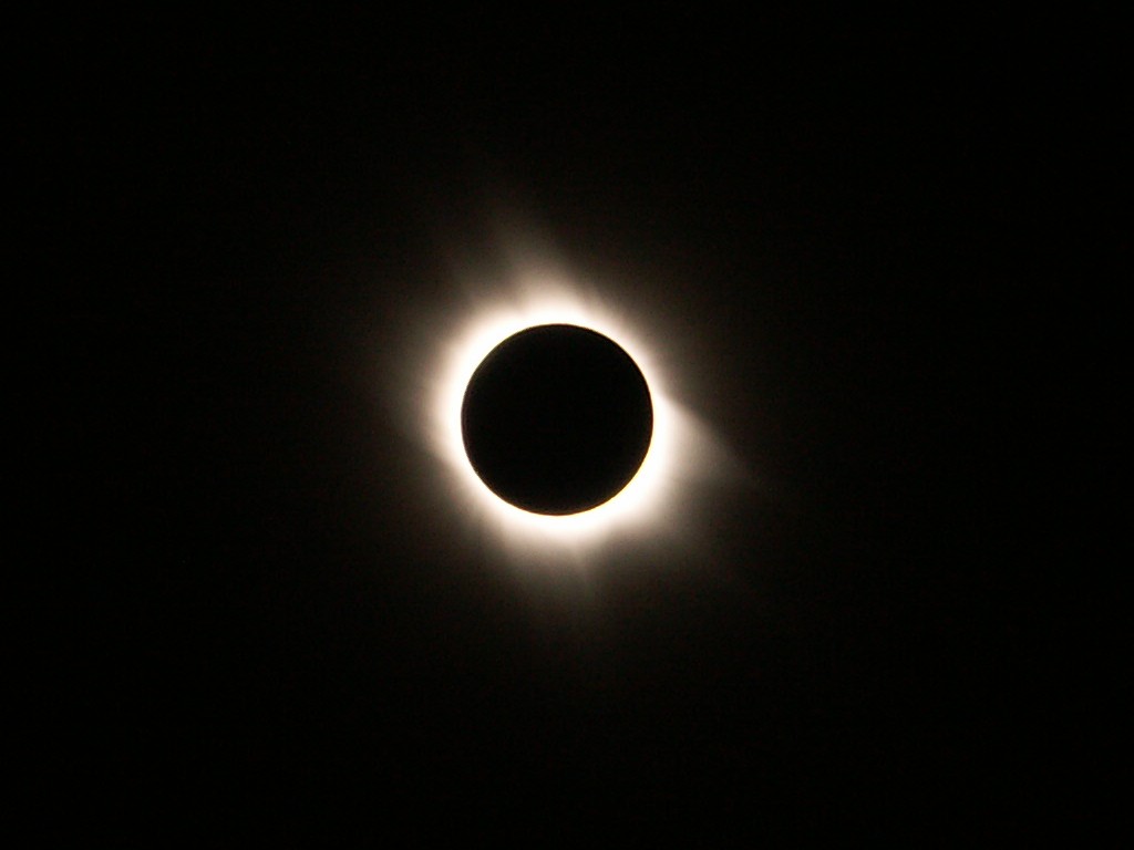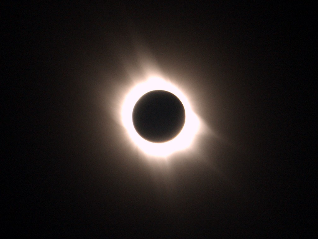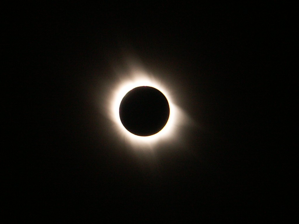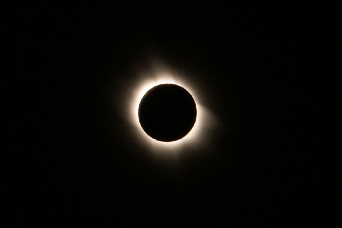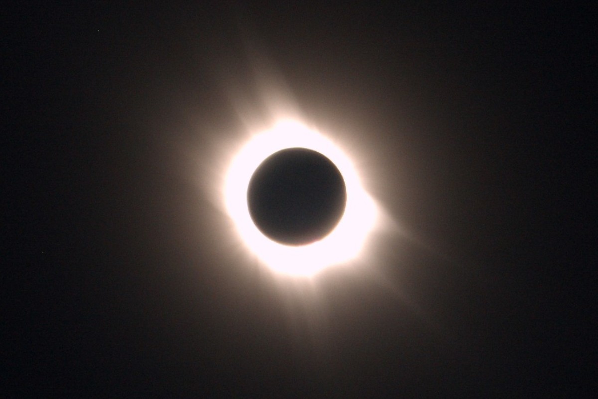 Noch immer kein Tier zu hören; weit weg von der Straße oder irgendeinem Ort, vergehen die Sekunden dieses Erlebnisses. Mir fielen die Fotoapparate ein; ich sollte wieder ein paar Bilder machen. Hoffentlich werden sie gut. Ich sollte nach oben sehen und nicht nur durch die Sucher, und da stand sie noch immer da. So groß ... so unerwartet groß. Ich kannte schon Darstellungen einer Sonnenfinsternis, und ehrlich gesagt war ich darauf eingestellt, etwas von der Größe eines Vollmondes hoch am Himmel zu sehen, umrandet von einer hellen Korona. Aber das, was dort zu sehen war, erschien geradezu riesig. Tatsächlich war die Korona links und rechts von der Sonne derart weit ausfasernd, dass die Scheibe mühelos nochmal auf beide Seiten gepasst hätte. Dieses Ding, das am Himmel auf uns herunterdröhnte - ja, dröhnen war das Wort, das mir immer wieder in den Sinn kam -, wäre es von einem Donnergrollen begleitet gewesen, man hätte es hingenommen. Aber so stand es da oben, prangte da oben, und tat dies in völliger Ruhe.