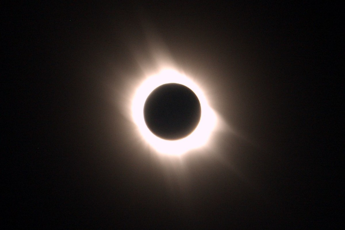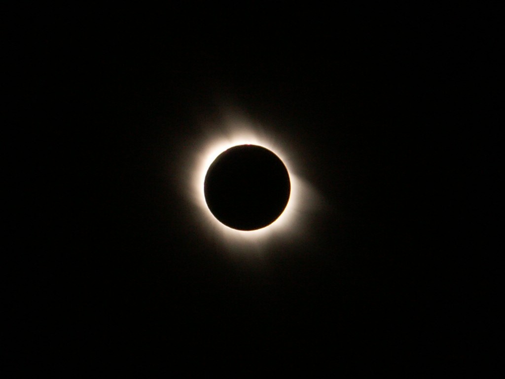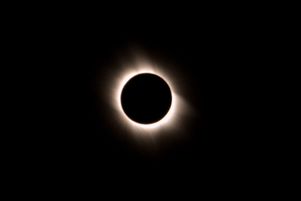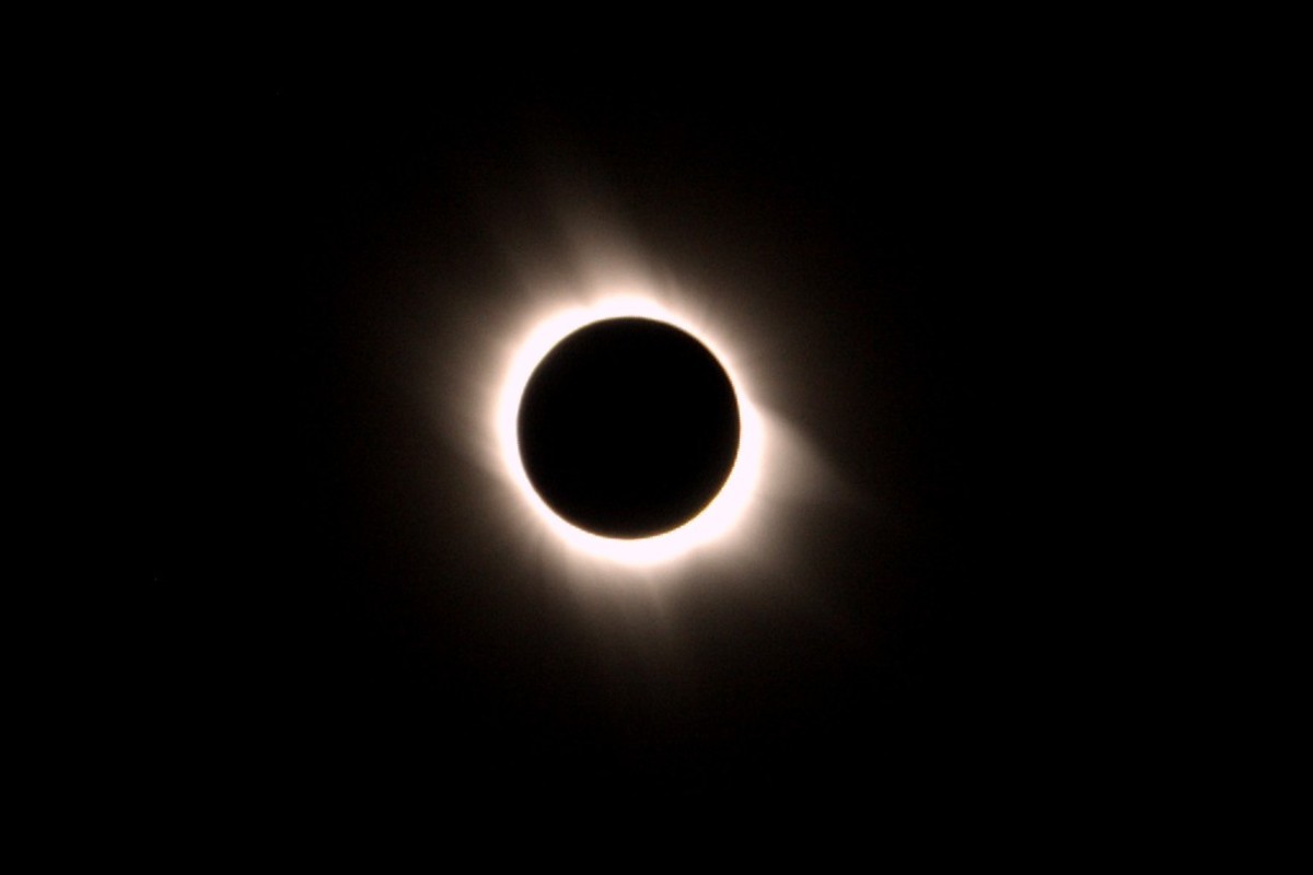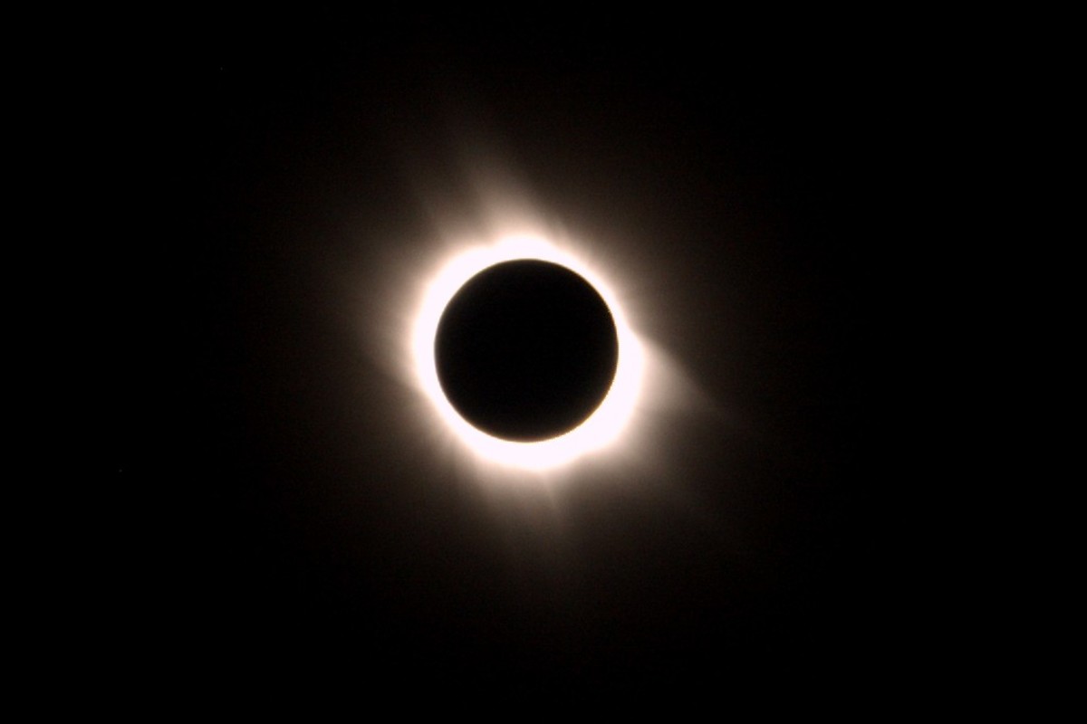 Noch immer kein Tier zu hören; weit weg von der Straße oder irgendeinem Ort, vergehen die Sekunden dieses Erlebnisses. Mir fielen die Fotoapparate ein; ich sollte wieder ein paar Bilder machen. Hoffentlich werden sie gut. Ich sollte nach oben sehen und nicht nur durch die Sucher, und da stand sie noch immer da. So groß ... so unerwartet groß. Ich kannte schon Darstellungen einer Sonnenfinsternis, und ehrlich gesagt war ich darauf eingestellt, etwas von der Größe eines Vollmondes hoch am Himmel zu sehen, umrandet von einer hellen Korona. Aber das, was dort zu sehen war, erschien geradezu riesig. Tatsächlich war die Korona links und rechts von der Sonne derart weit ausfasernd, dass die Scheibe mühelos nochmal auf beide Seiten gepasst hätte. Dieses Ding, das am Himmel auf uns herunterdröhnte - ja, dröhnen war das Wort, das mir immer wieder in den Sinn kam -, wäre es von einem Donnergrollen begleitet gewesen, man hätte es hingenommen. Aber so stand es da oben, prangte da oben, und tat dies in völliger Ruhe.