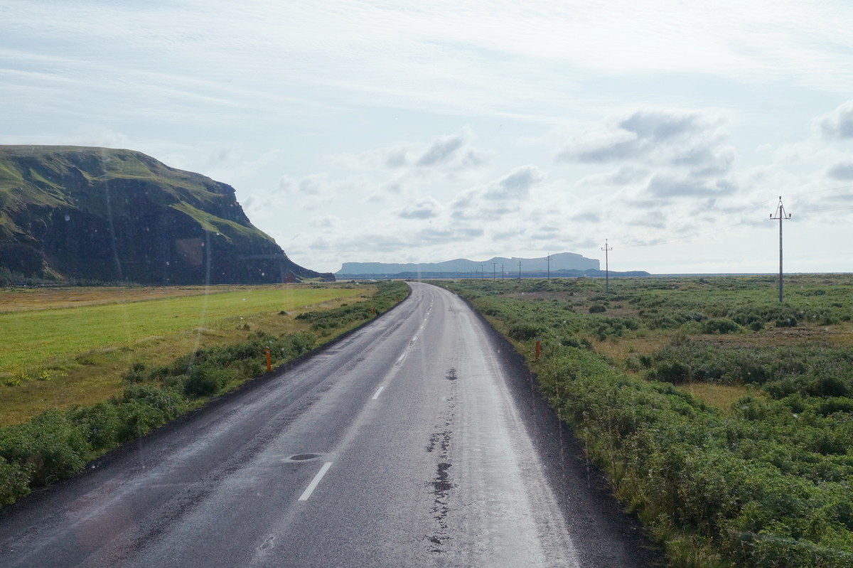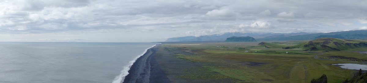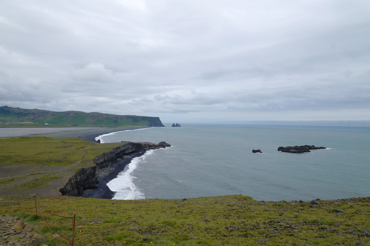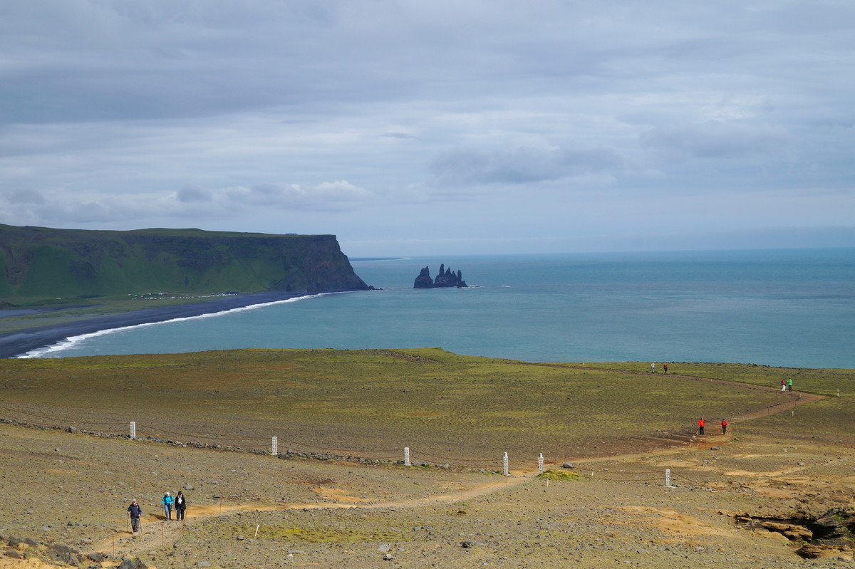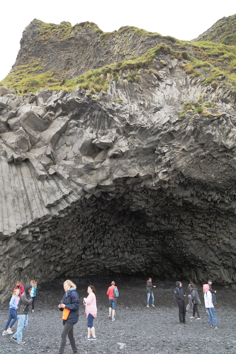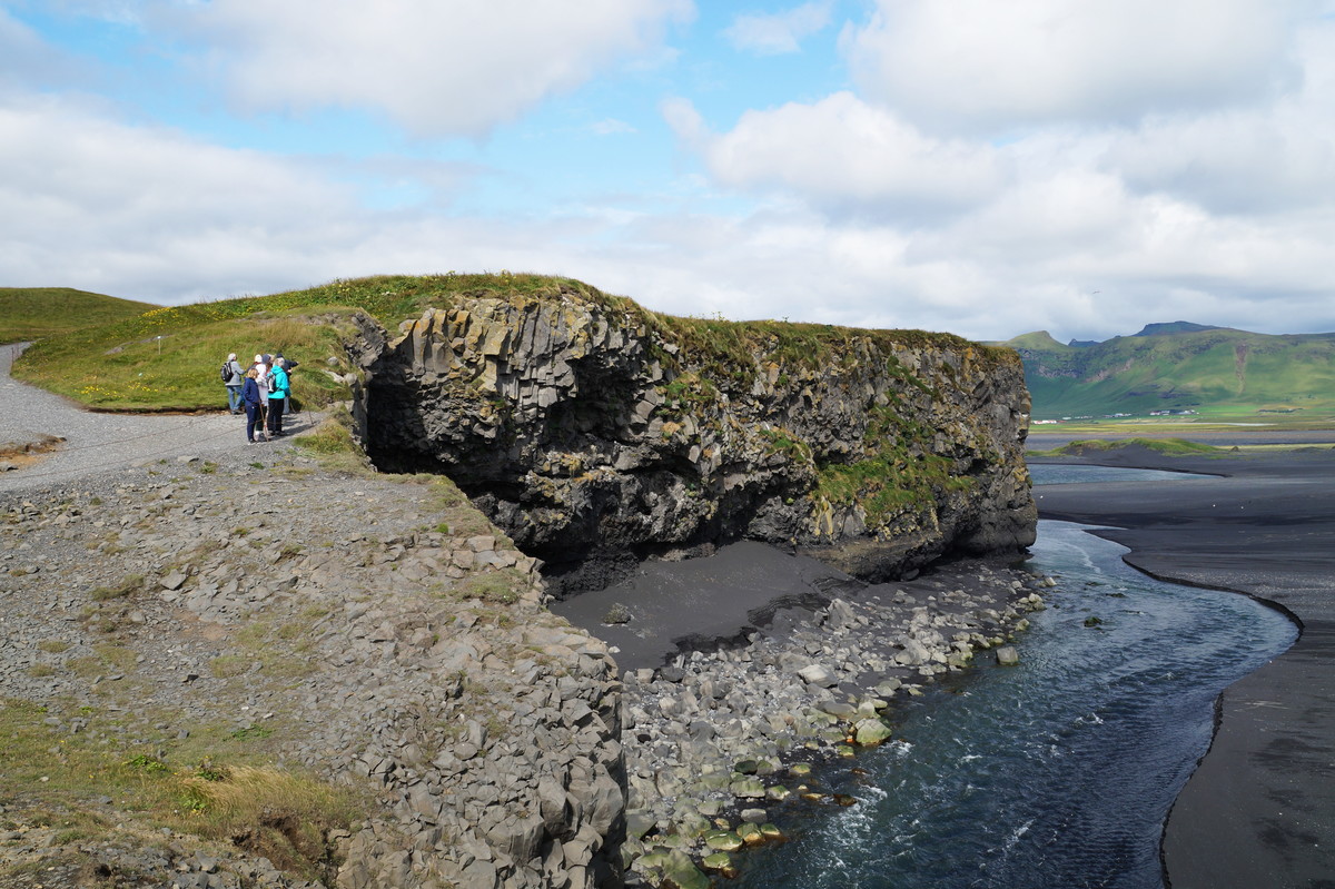 Die Fahrt geht weiter der Küste entlang, über zahllose weit ausgestreckte Sander (Lava-Sandfelder, Schotterebenen). Wir treffen an einer besonders eindrucksvollen Bucht ein, der Dyrhólaey ("Tür-Loch-Insel"). Dort finden sich schroffe Felsen, endlose Blicke über die Küste, aber auch Papageitaucher en masse. Wir fahren mit dem Bus um die Lagune herum zum Reynisfjall, an dessen Fuß sich eine Wand aus Basaltsäulen auftürmt. Der Sand ist völlig schwarz hier. Wieder geht es weiter, diesmal zum Hótel Búrfell in Steig, ein paar Kilometer die Straße zurück.