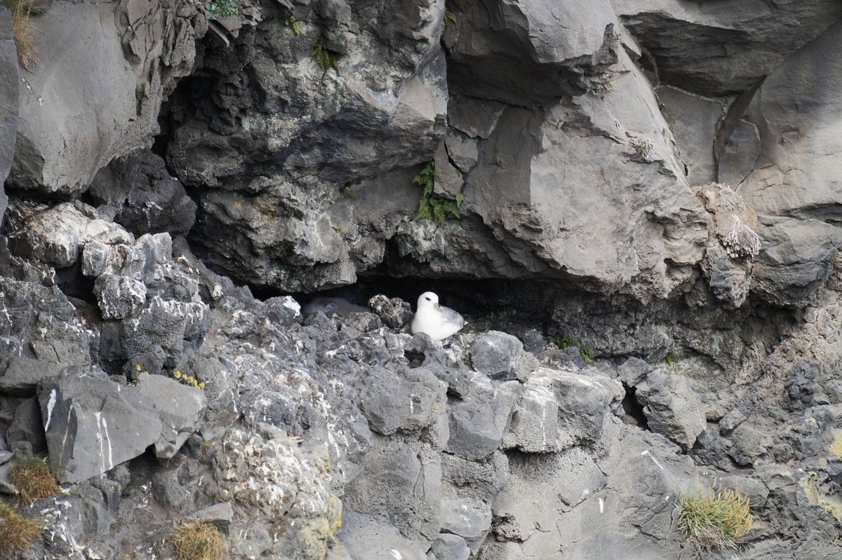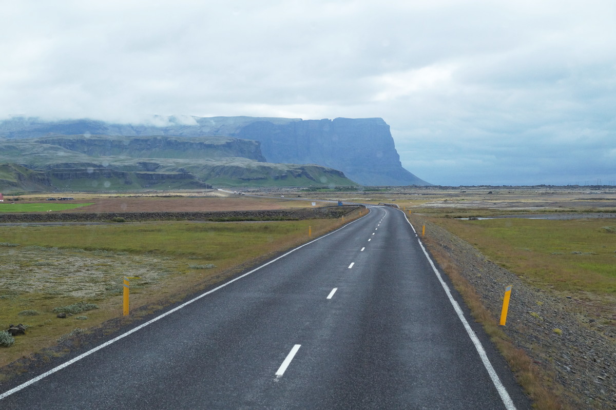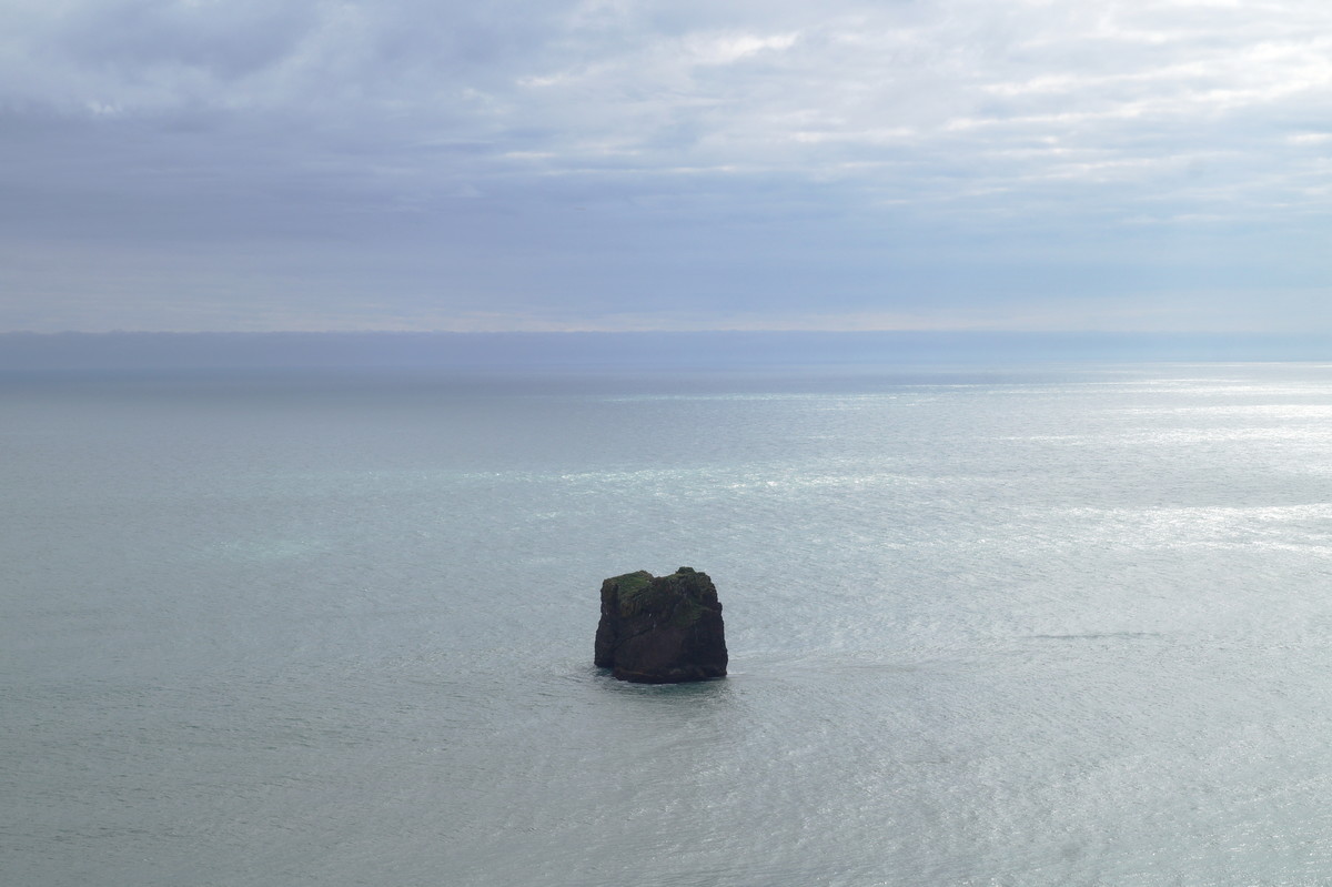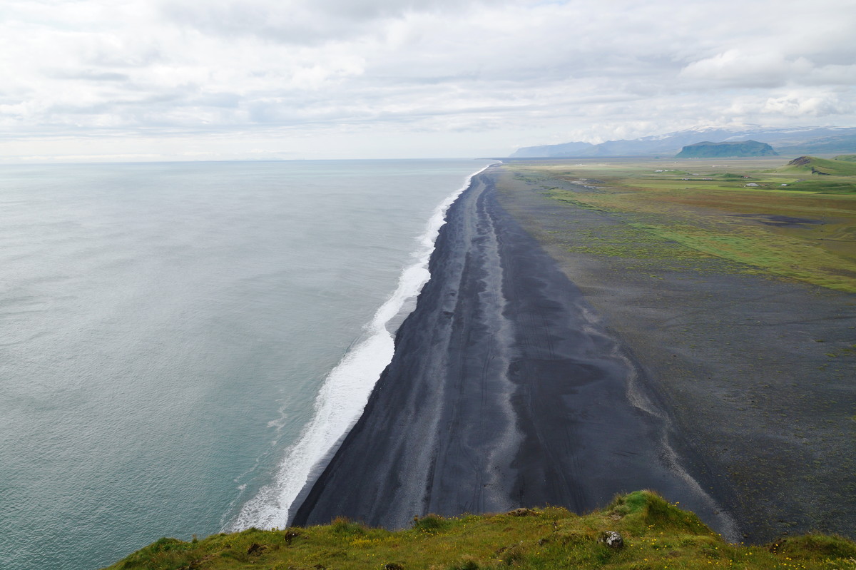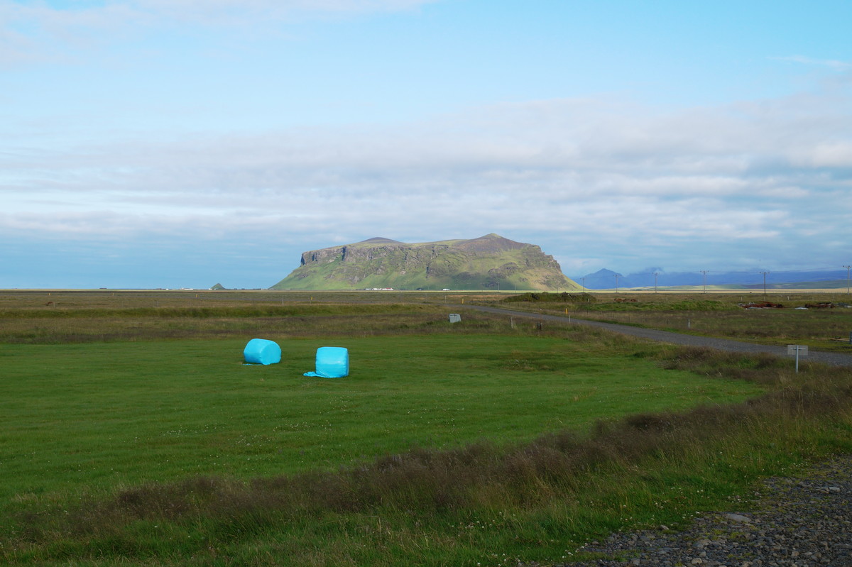 Die Fahrt geht weiter der Küste entlang, über zahllose weit ausgestreckte Sander (Lava-Sandfelder, Schotterebenen). Wir treffen an einer besonders eindrucksvollen Bucht ein, der Dyrhólaey ("Tür-Loch-Insel"). Dort finden sich schroffe Felsen, endlose Blicke über die Küste, aber auch Papageitaucher en masse. Wir fahren mit dem Bus um die Lagune herum zum Reynisfjall, an dessen Fuß sich eine Wand aus Basaltsäulen auftürmt. Der Sand ist völlig schwarz hier. Wieder geht es weiter, diesmal zum Hótel Búrfell in Steig, ein paar Kilometer die Straße zurück.
