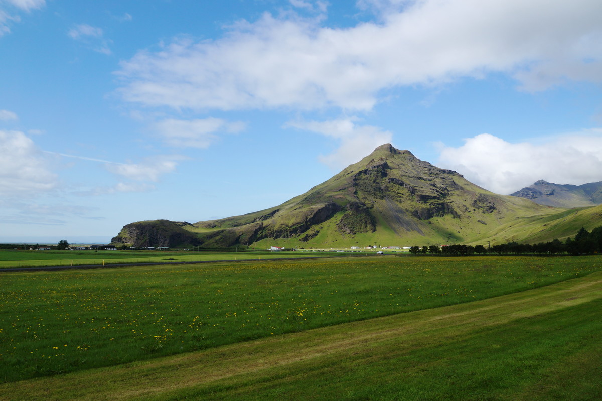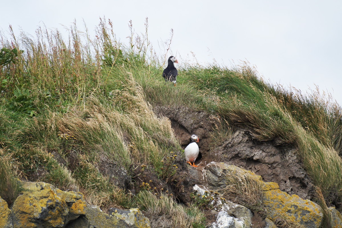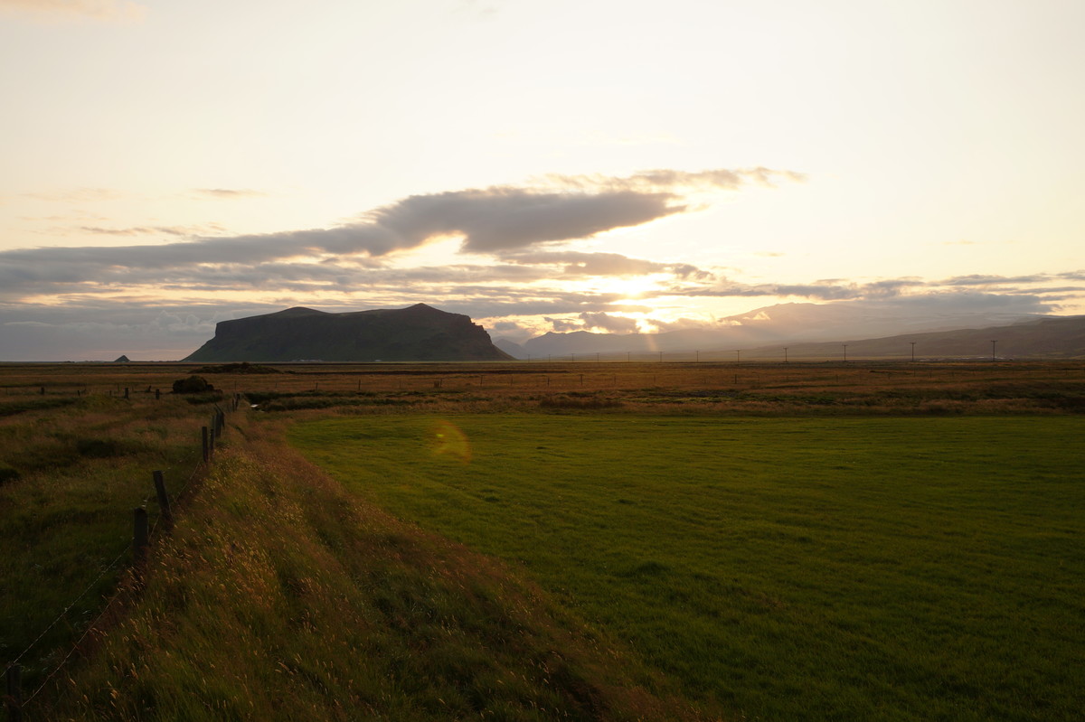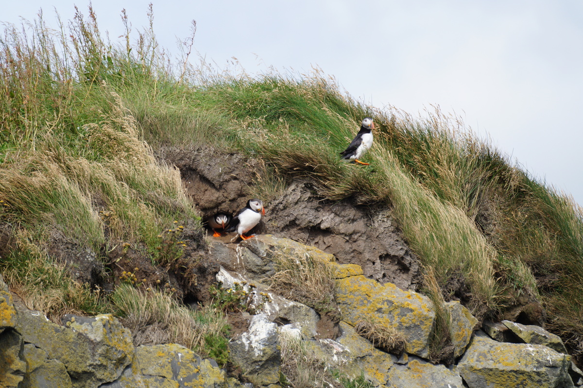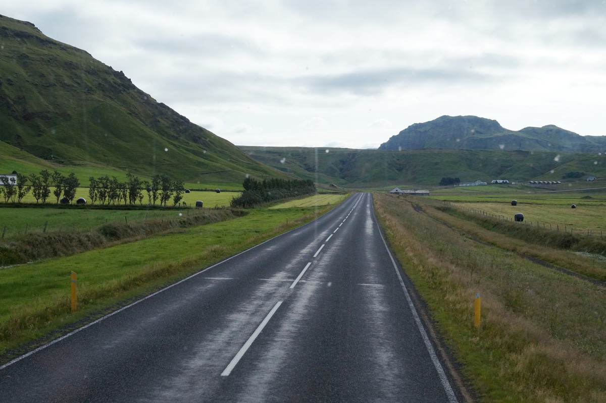 Die Fahrt geht weiter der Küste entlang, über zahllose weit ausgestreckte Sander (Lava-Sandfelder, Schotterebenen). Wir treffen an einer besonders eindrucksvollen Bucht ein, der Dyrhólaey ("Tür-Loch-Insel"). Dort finden sich schroffe Felsen, endlose Blicke über die Küste, aber auch Papageitaucher en masse. Wir fahren mit dem Bus um die Lagune herum zum Reynisfjall, an dessen Fuß sich eine Wand aus Basaltsäulen auftürmt. Der Sand ist völlig schwarz hier. Wieder geht es weiter, diesmal zum Hótel Búrfell in Steig, ein paar Kilometer die Straße zurück.