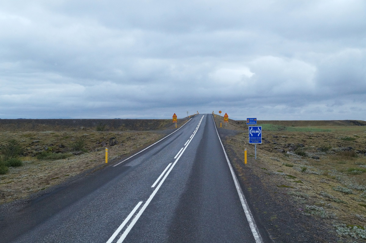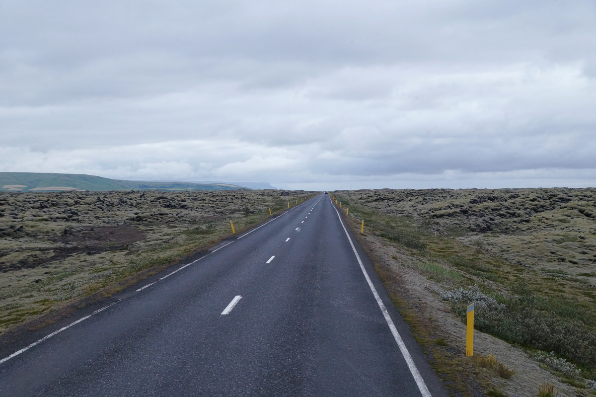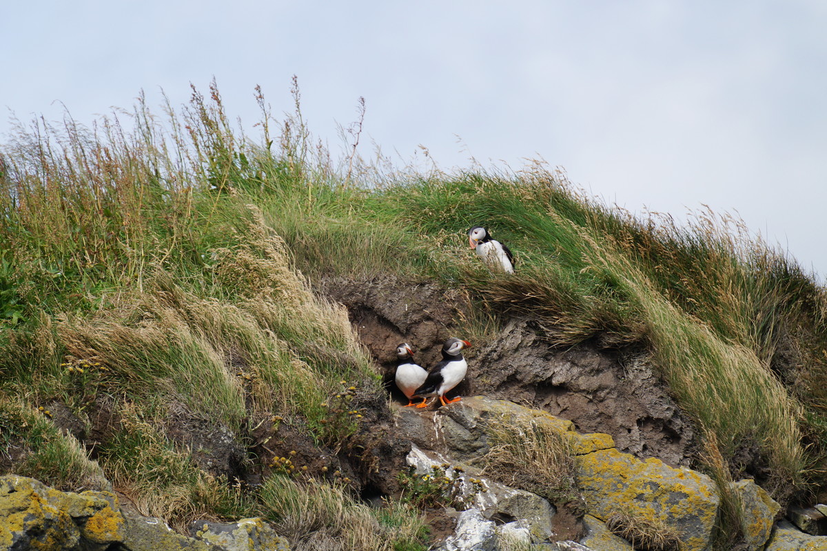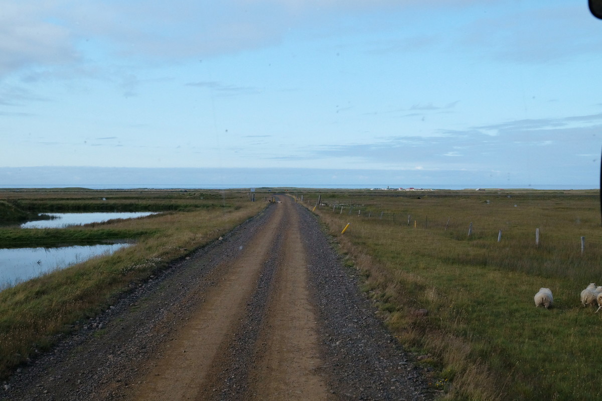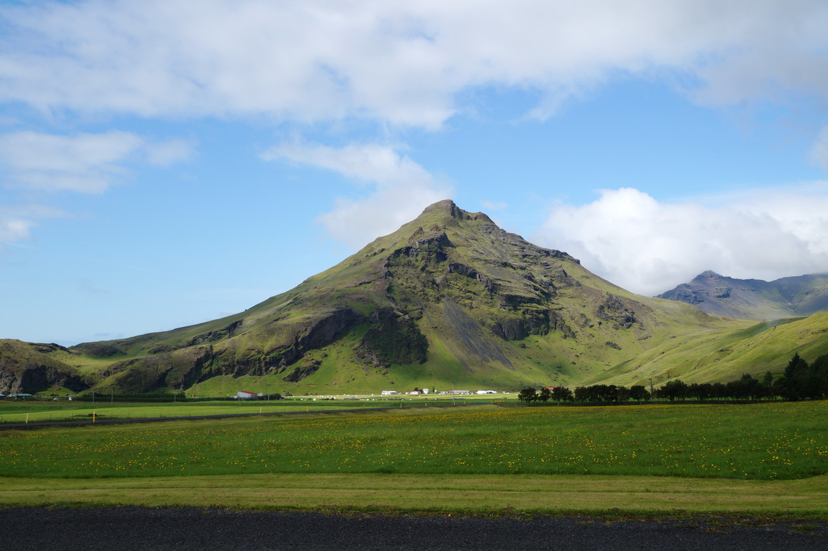 Die Fahrt geht weiter der Küste entlang, über zahllose weit ausgestreckte Sander (Lava-Sandfelder, Schotterebenen). Wir treffen an einer besonders eindrucksvollen Bucht ein, der Dyrhólaey ("Tür-Loch-Insel"). Dort finden sich schroffe Felsen, endlose Blicke über die Küste, aber auch Papageitaucher en masse. Wir fahren mit dem Bus um die Lagune herum zum Reynisfjall, an dessen Fuß sich eine Wand aus Basaltsäulen auftürmt. Der Sand ist völlig schwarz hier. Wieder geht es weiter, diesmal zum Hótel Búrfell in Steig, ein paar Kilometer die Straße zurück.