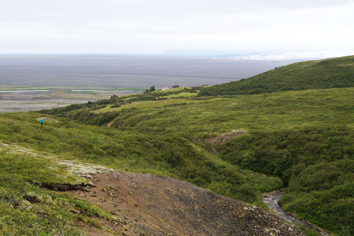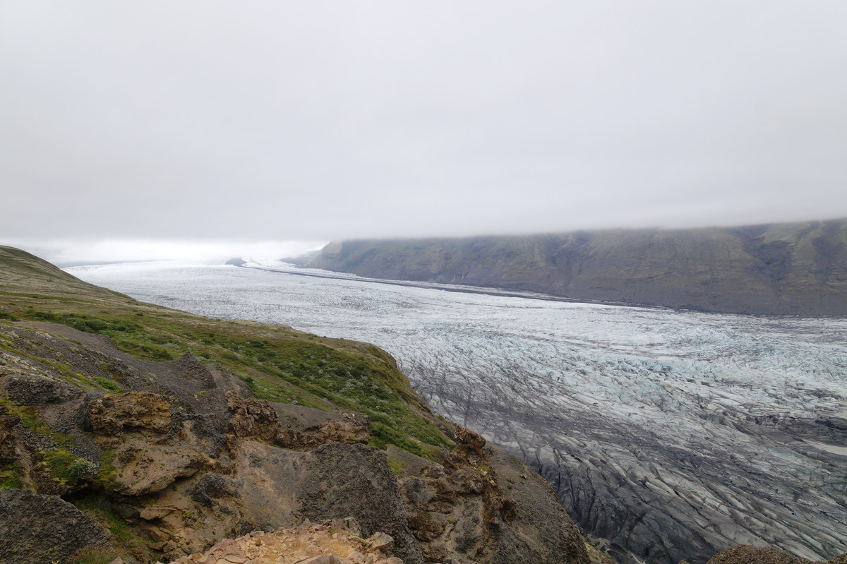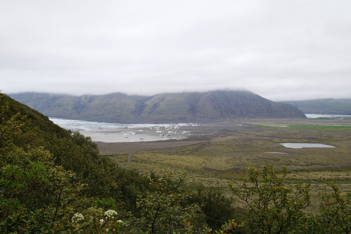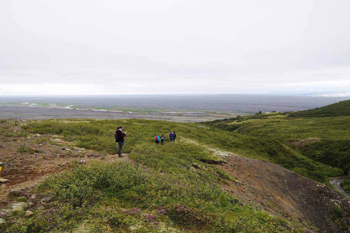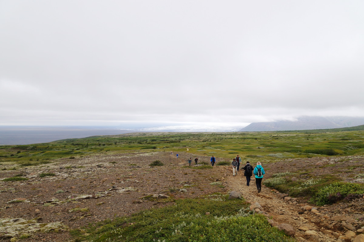 Von hier aus geht es am nächsten Tag weiter, wieder über Sander, kurze Rast in Kirkubæjarsklaustur, dann treffen wir an unserem nächsten Wanderpunkt ein. Unser Ziel sind jedoch nicht die Wasserfälle wie Svartifoss und Hundafoss, sondern der Blick auf den Gletscherausläufer Skaftafellsjökull. Er gehört letztlich zum riesigen Vatnajökull. Wir wandern etwas über eine Stunde auf den Bergrücken hinauf, machen ein ausgiebiges Picknick mit Blick auf den Gletscher, wandern dann wieder hinunter zum Bus.