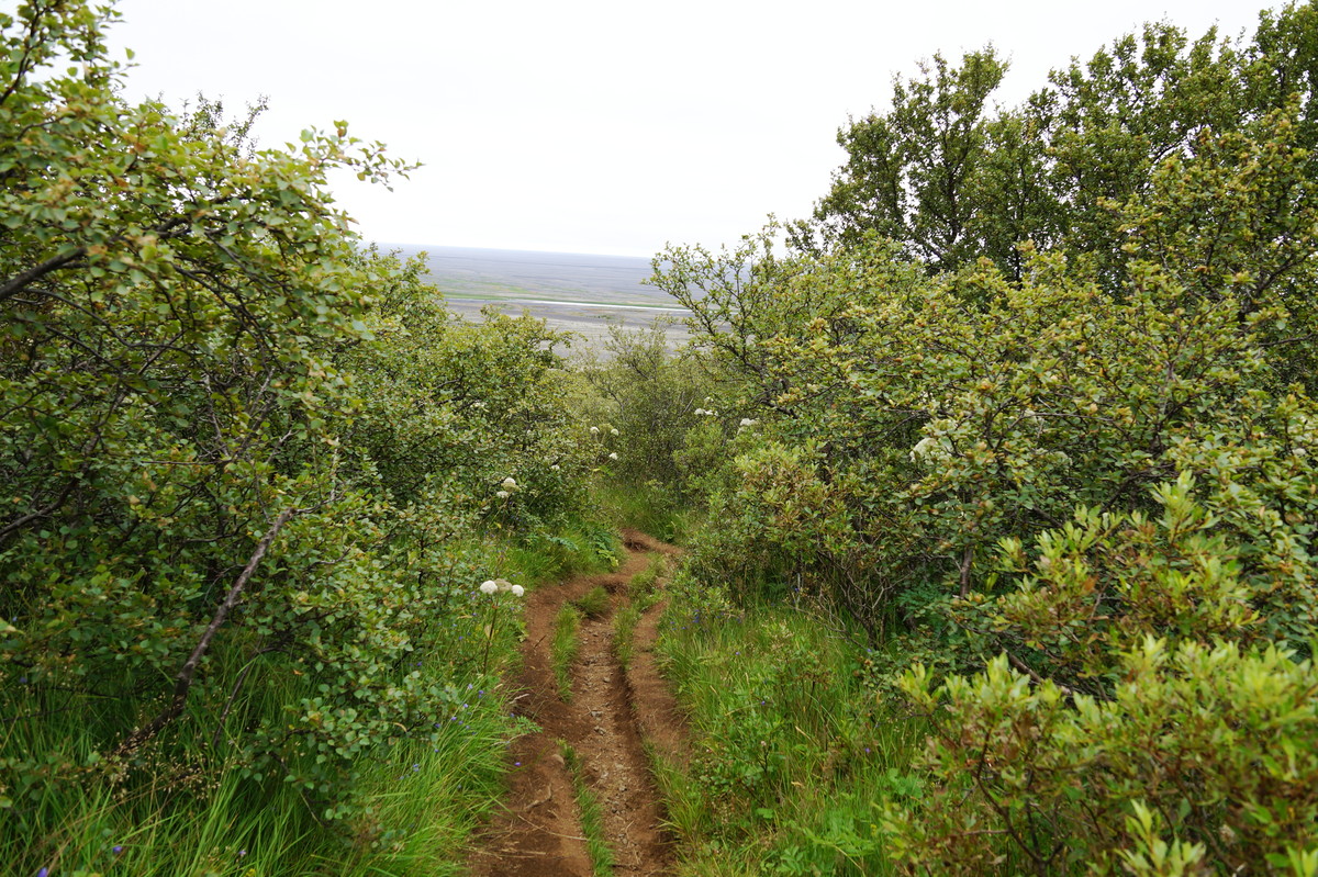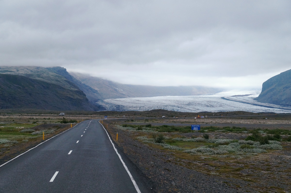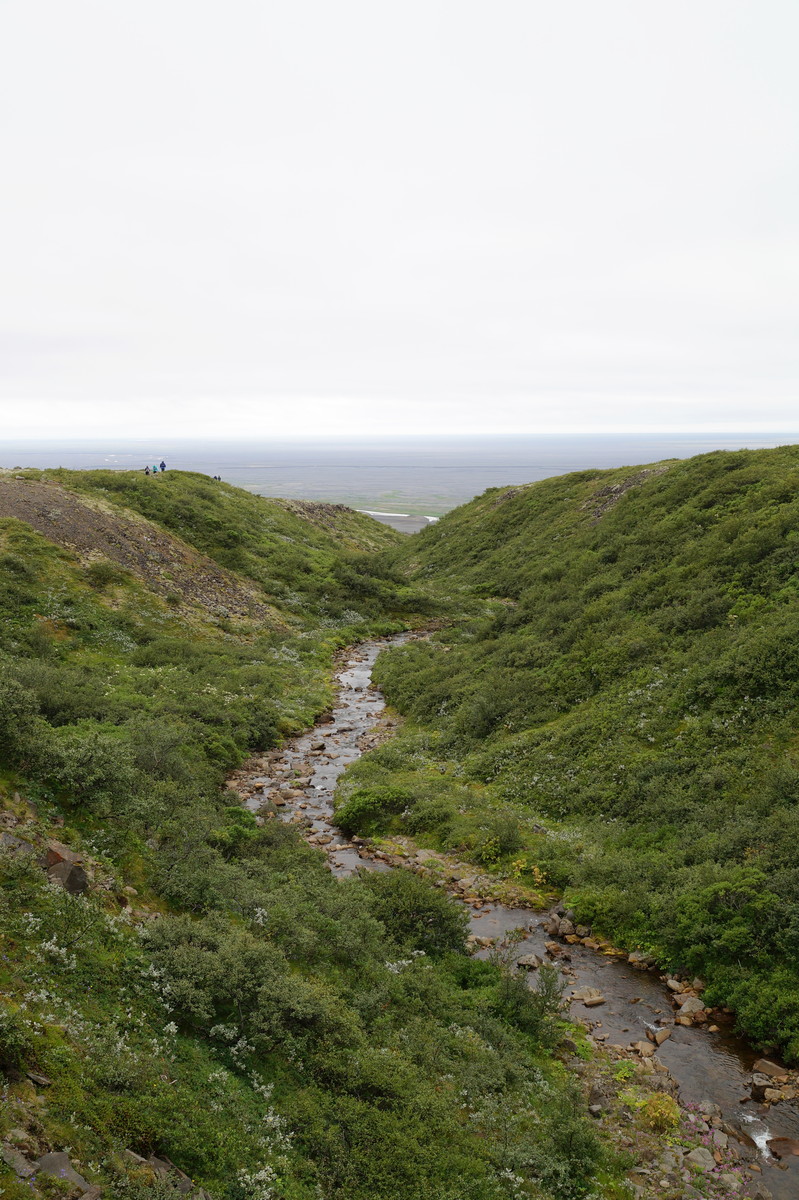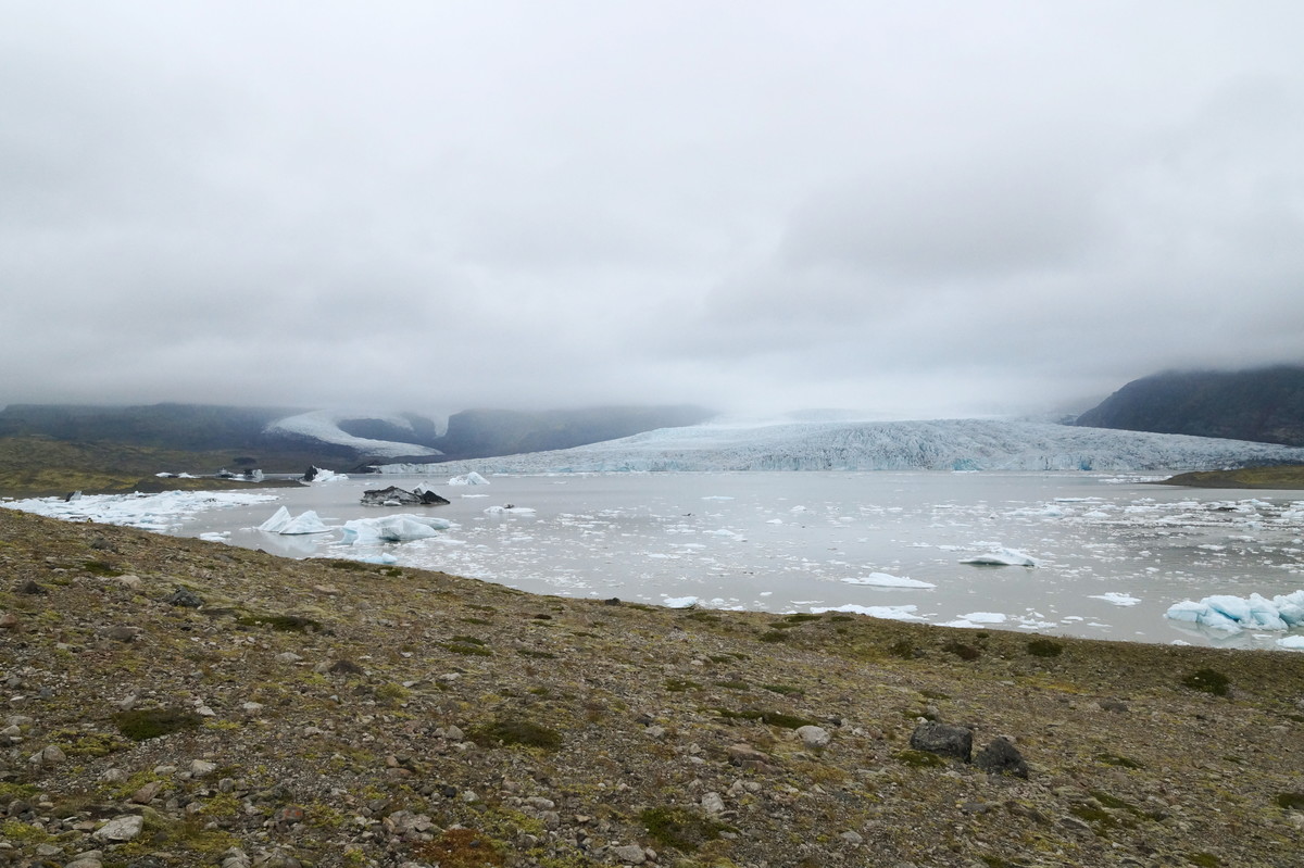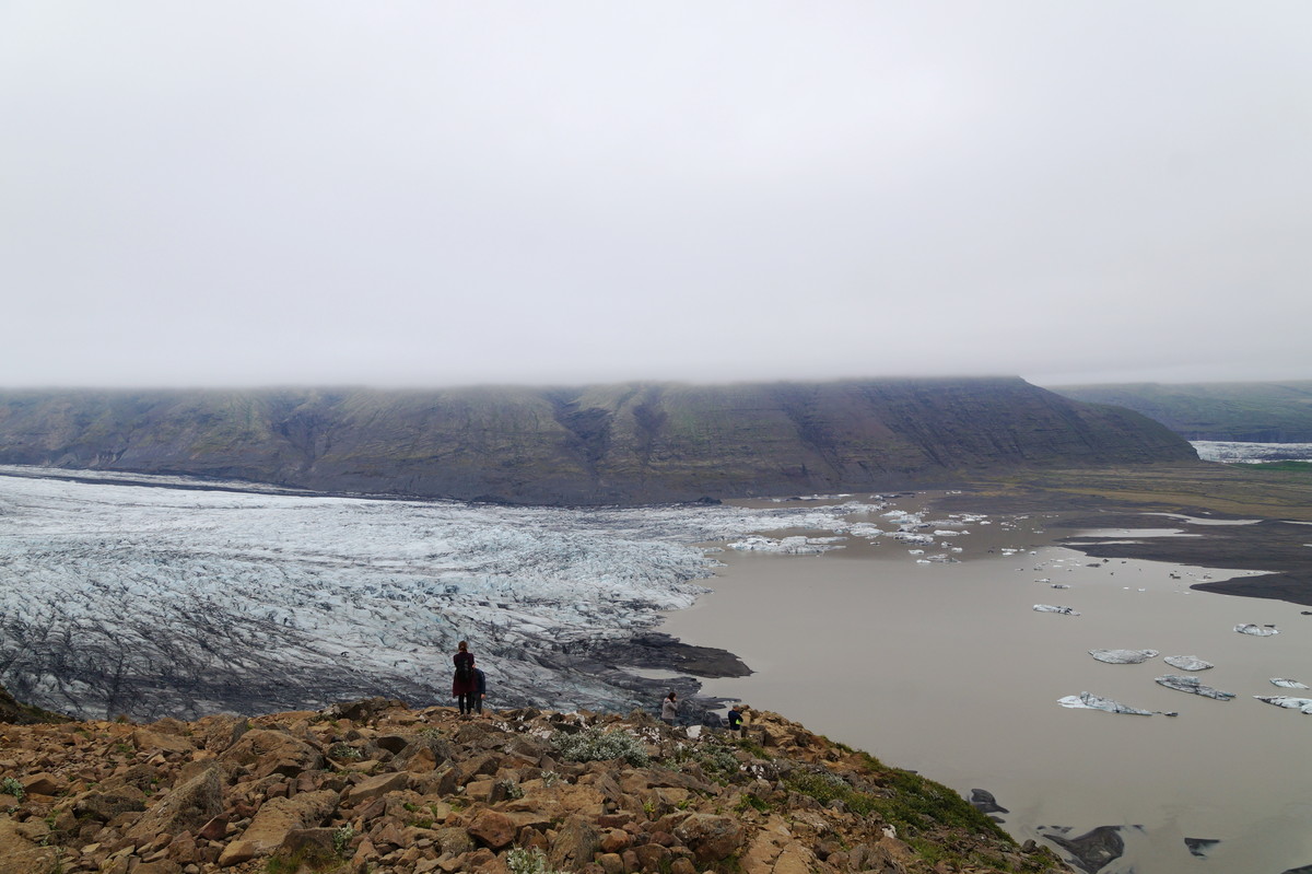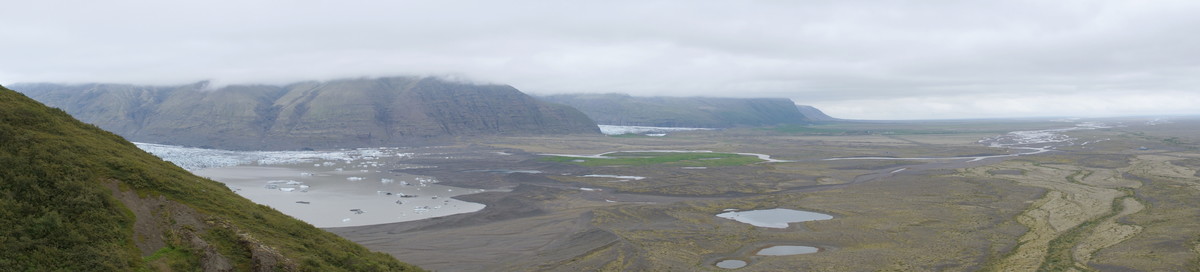 Von hier aus geht es am nächsten Tag weiter, wieder über Sander, kurze Rast in Kirkubæjarsklaustur, dann treffen wir an unserem nächsten Wanderpunkt ein. Unser Ziel sind jedoch nicht die Wasserfälle wie Svartifoss und Hundafoss, sondern der Blick auf den Gletscherausläufer Skaftafellsjökull. Er gehört letztlich zum riesigen Vatnajökull. Wir wandern etwas über eine Stunde auf den Bergrücken hinauf, machen ein ausgiebiges Picknick mit Blick auf den Gletscher, wandern dann wieder hinunter zum Bus.