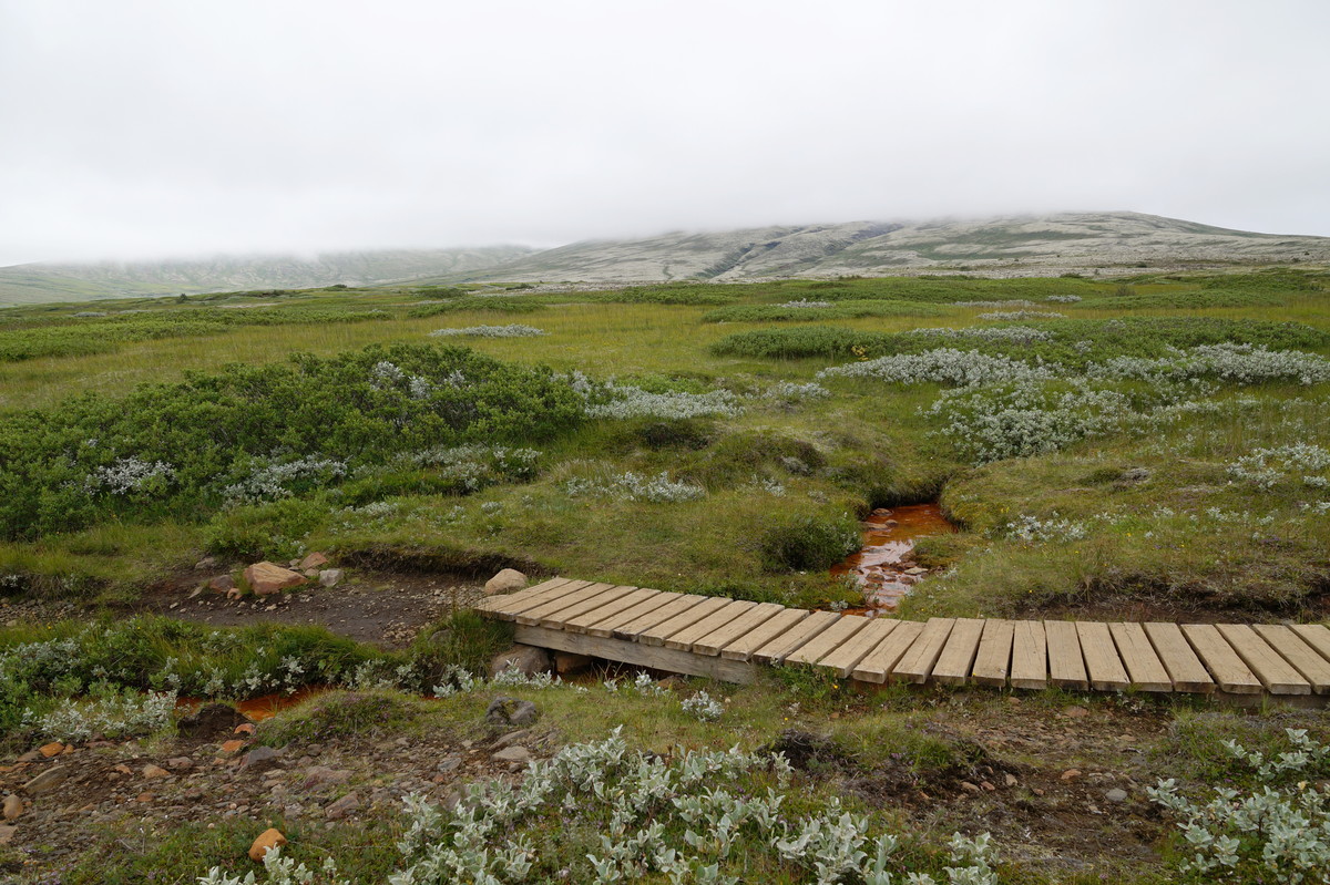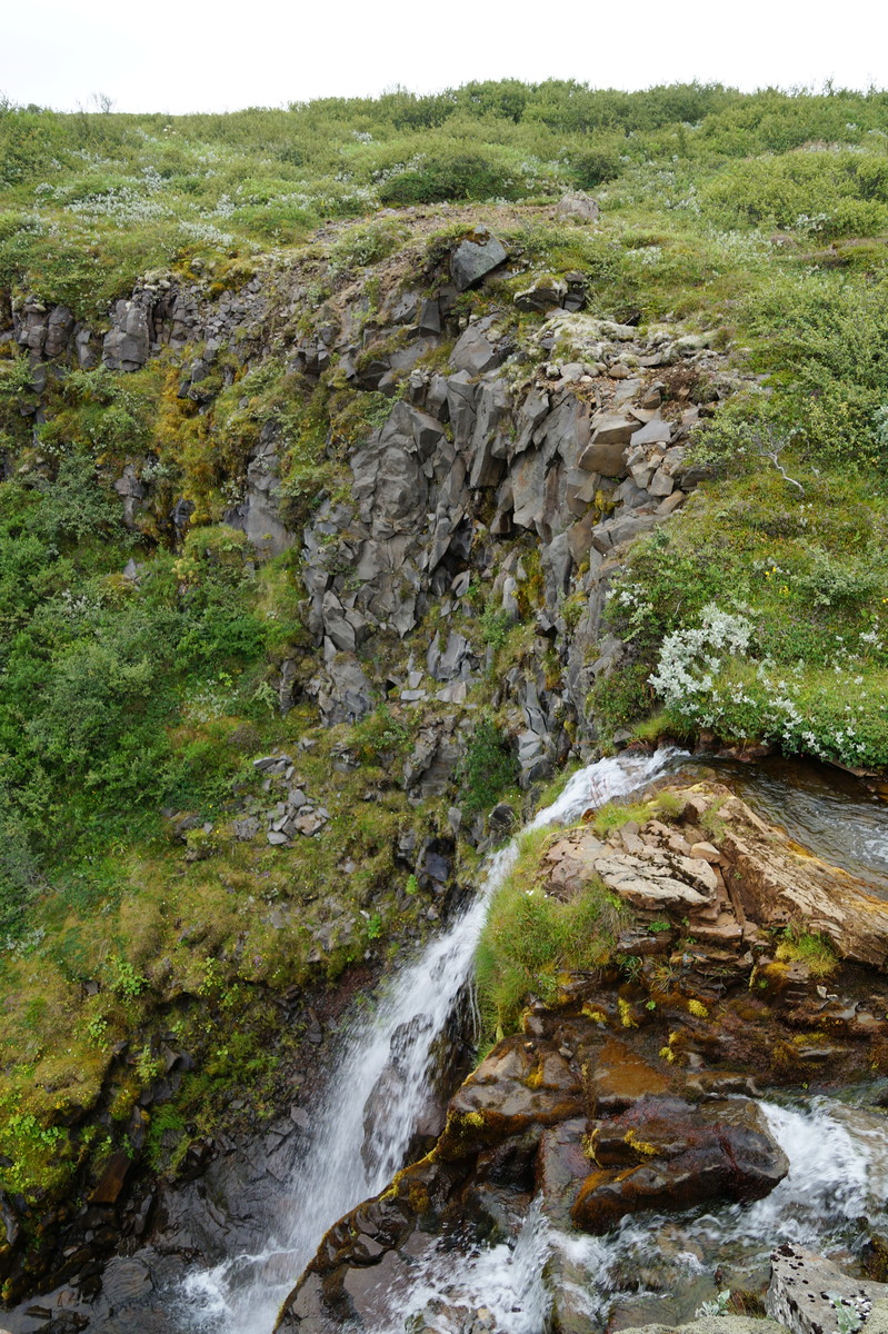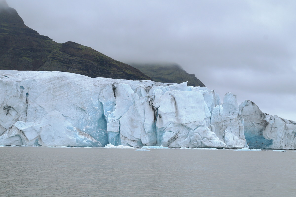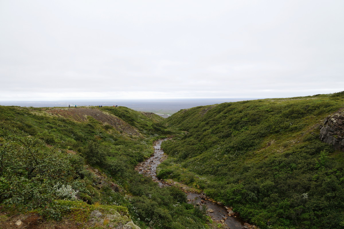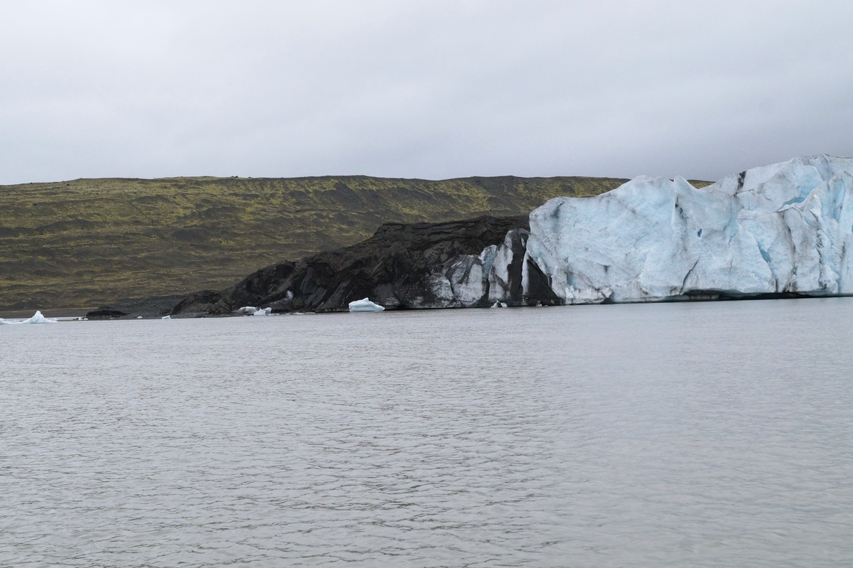 Von hier aus geht es am nächsten Tag weiter, wieder über Sander, kurze Rast in Kirkubæjarsklaustur, dann treffen wir an unserem nächsten Wanderpunkt ein. Unser Ziel sind jedoch nicht die Wasserfälle wie Svartifoss und Hundafoss, sondern der Blick auf den Gletscherausläufer Skaftafellsjökull. Er gehört letztlich zum riesigen Vatnajökull. Wir wandern etwas über eine Stunde auf den Bergrücken hinauf, machen ein ausgiebiges Picknick mit Blick auf den Gletscher, wandern dann wieder hinunter zum Bus.