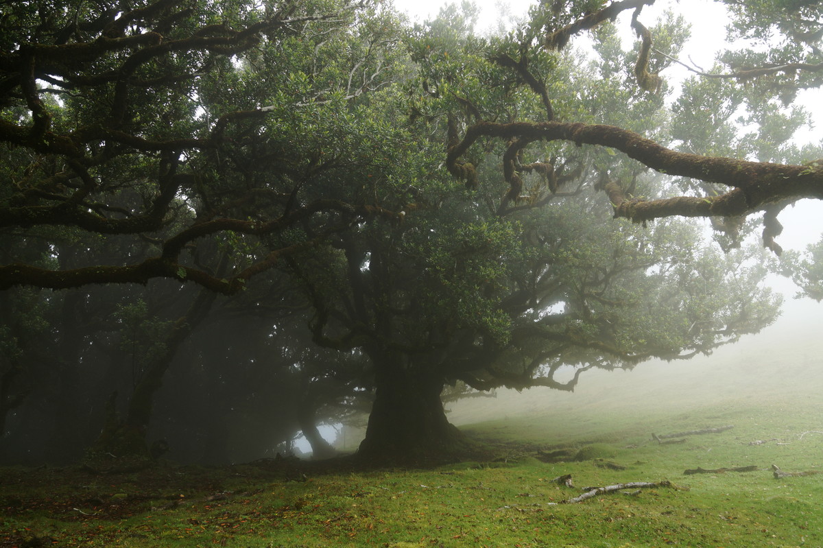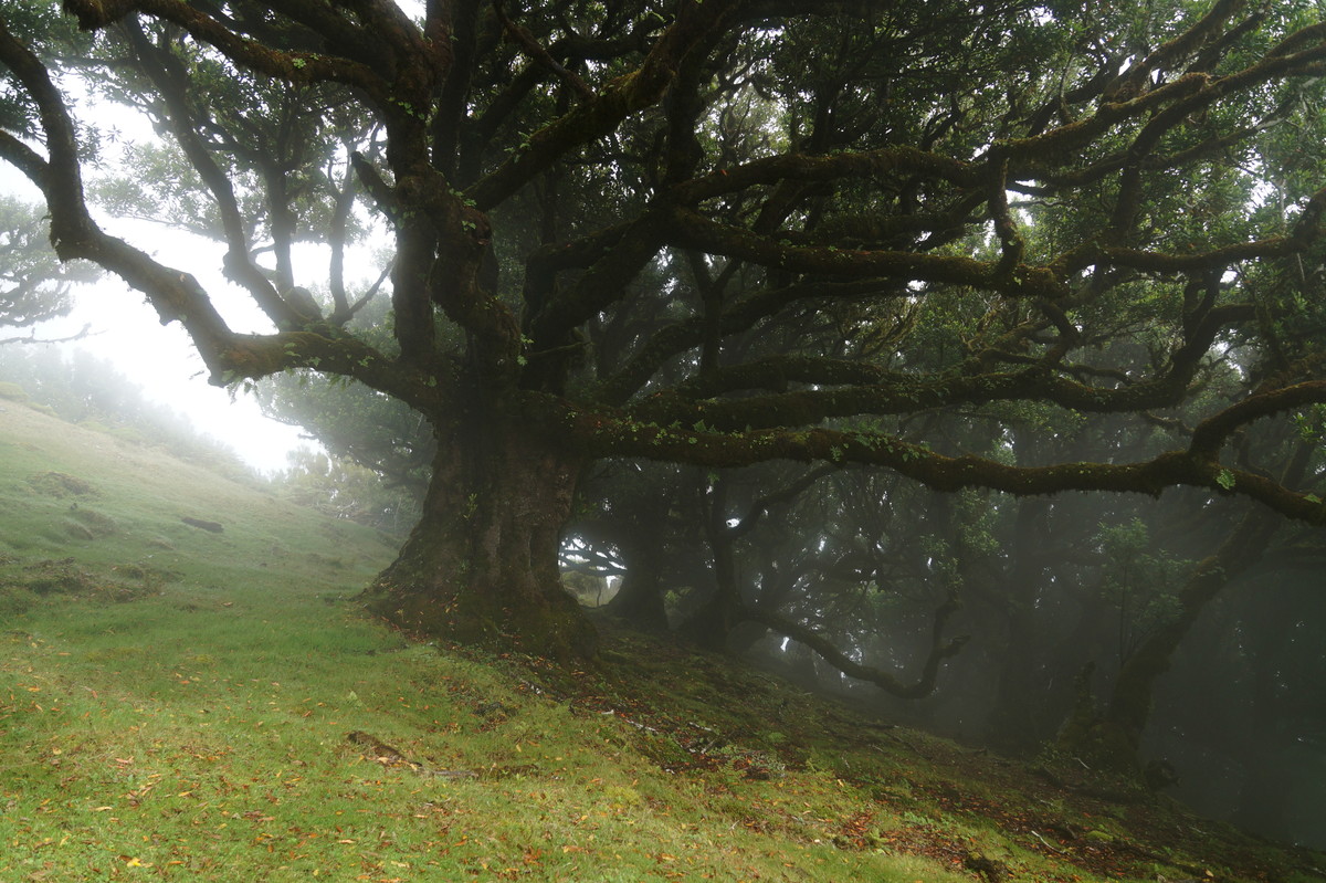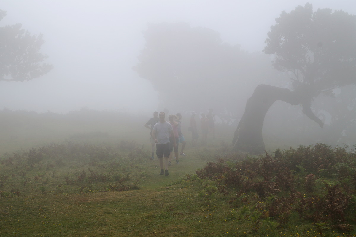 Der erste große Programmpunkt dieses Tages ist die Vereda do Fanal, ein Wanderweg. Am Rande der Hochebene gelegen kann man endlich den Blick in die Ferne schweifen lassen ... wenn der Nebel nicht wäre, und davon gibt es hier reichlich. Zwischendurch klart es immer mal kurz auf, aber der Nebel verschwindet erst, als wir den Bus wieder erreichen. Betrachtet man es etwas positiver, so hat der Nebel schon zu einer geheimnisvollen Stimmung beigetragen, unterstützt von den knorrigen Bäumen.