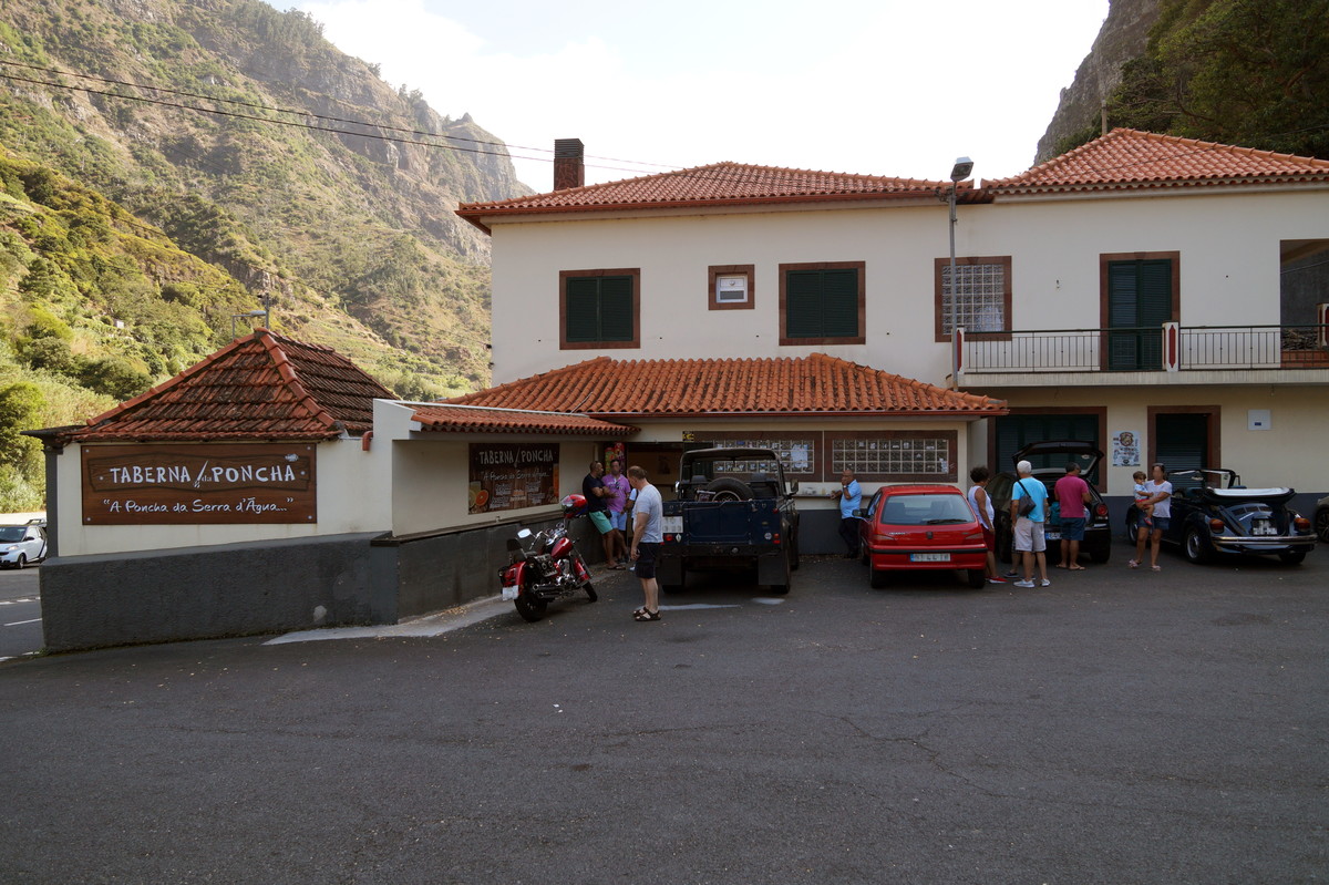 Danach geht es wieder zurück; wir halten an einem bekannten Wasserfall, dem Brautschleier (Véu da Noiva) und genehmigen uns einen Drink an der Taberna da Poncha.