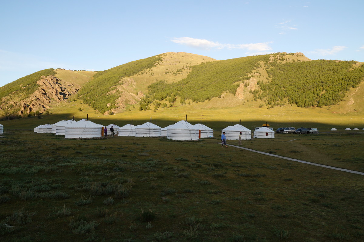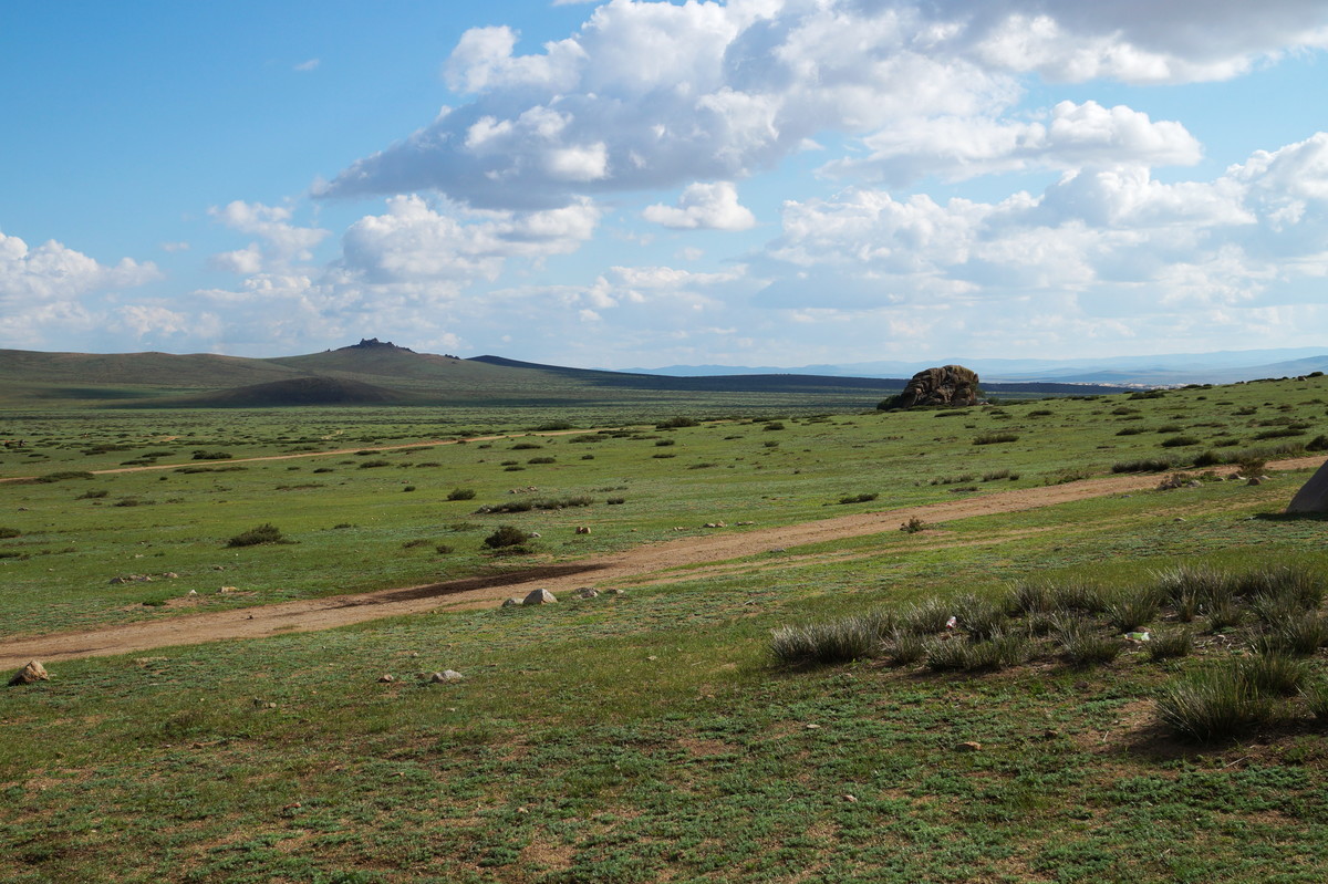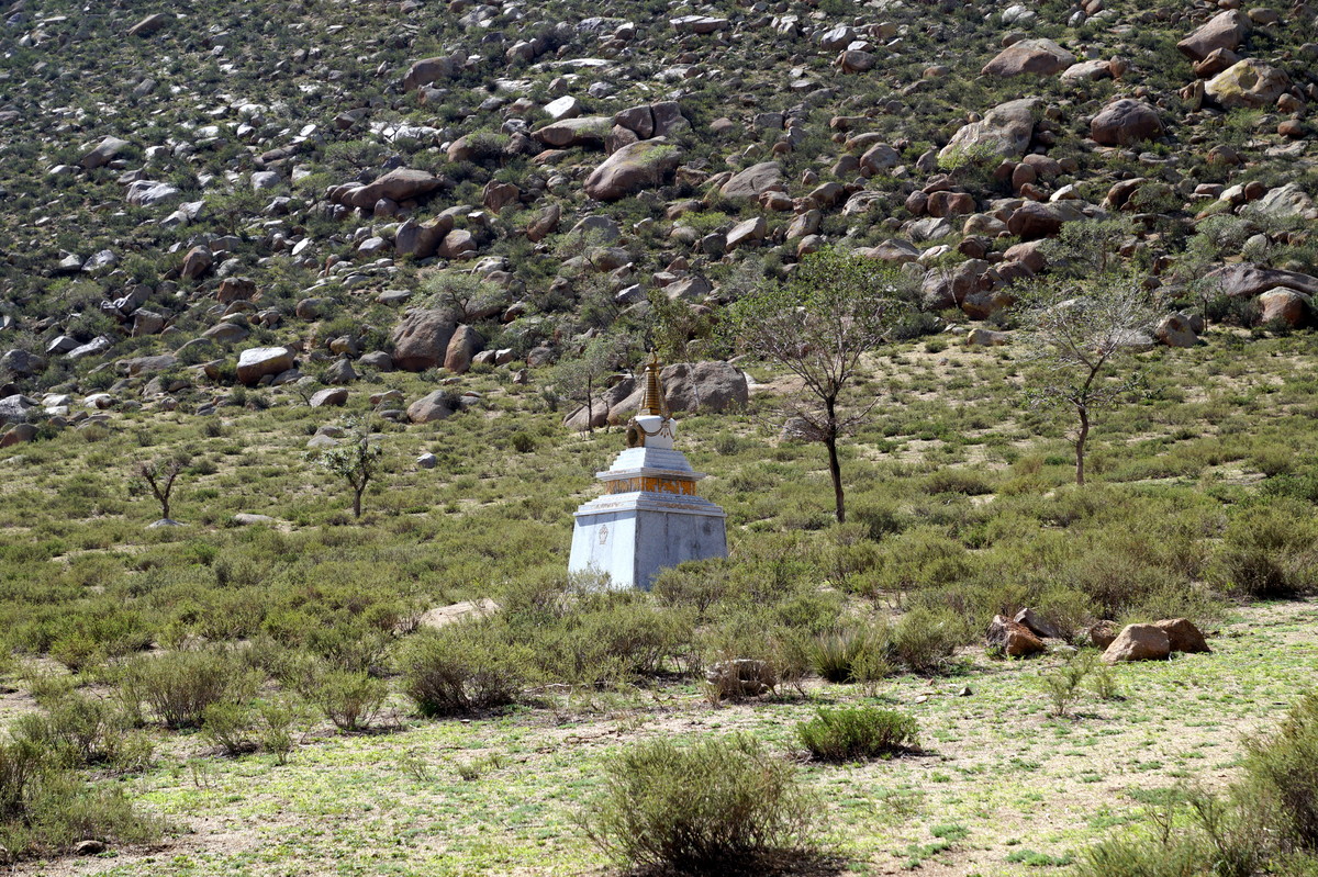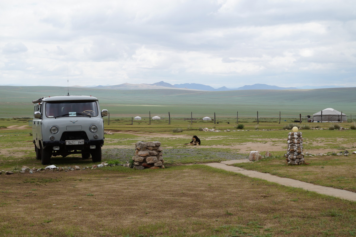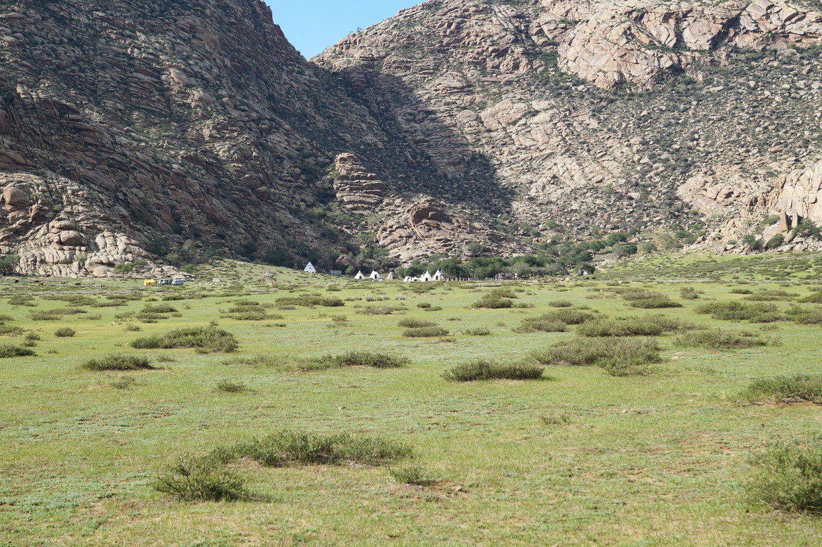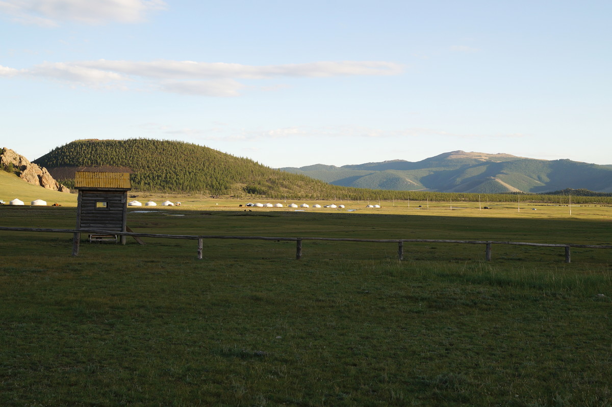 Khankhar Uul (Bulgan). Mittags gegen 14:00 Uhr erreichen wir das nächste Ger-Camp Khankhar Uul. Um den Berg herum erreicht man das Khamba-Kloster (Erdene Khambiin Khiid). Der Bergrücken hinter dem Camp ist der Khögnö Khan Uul.