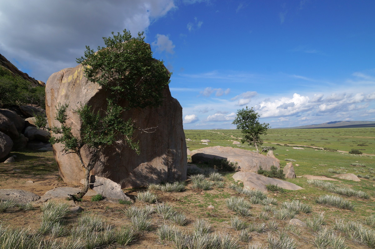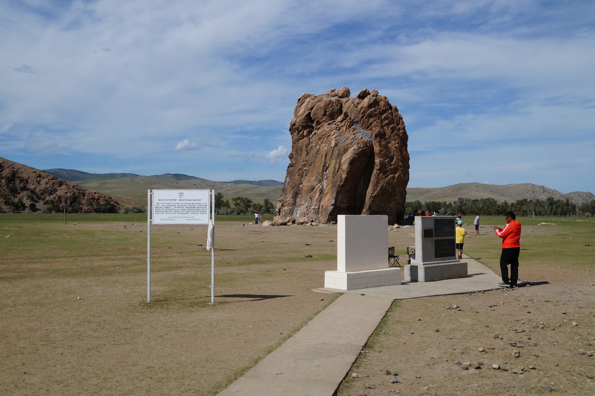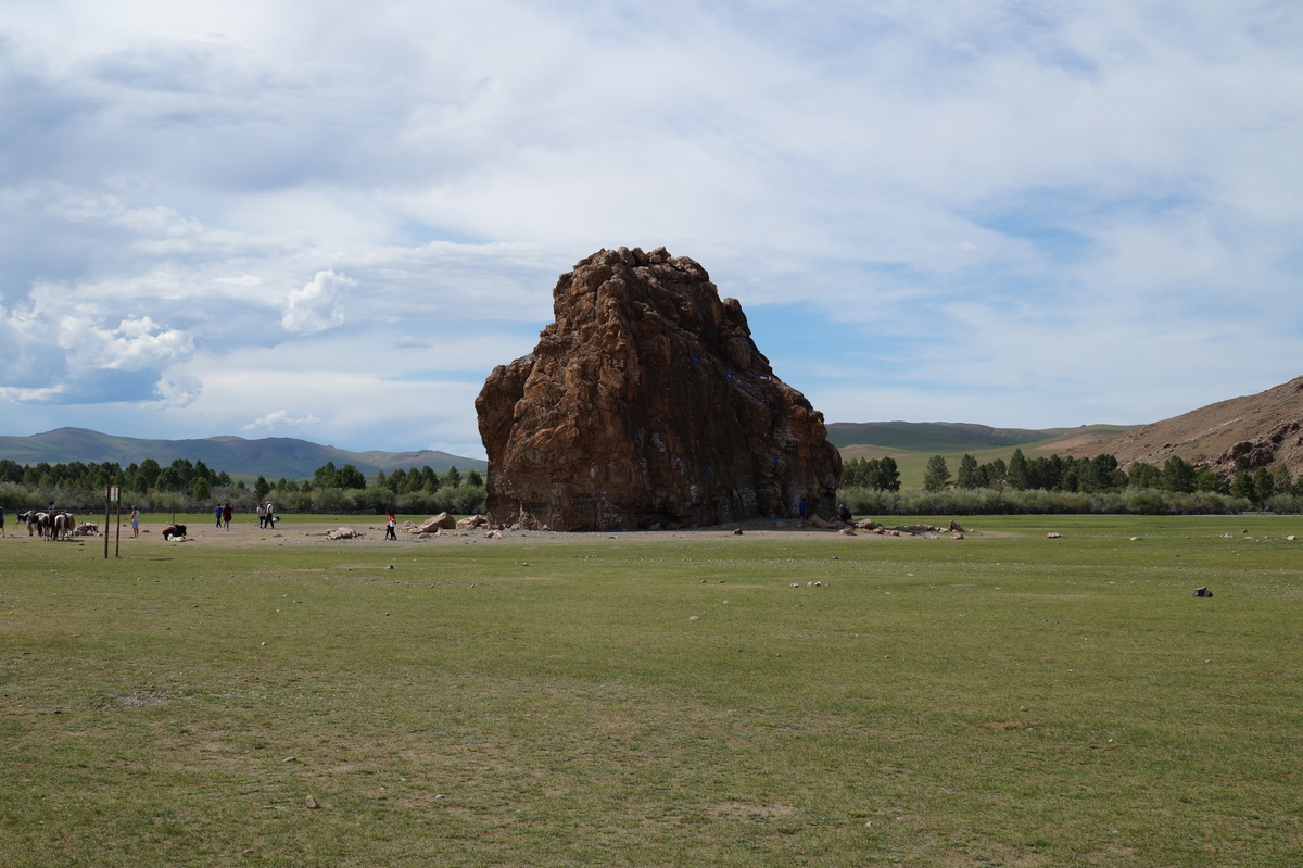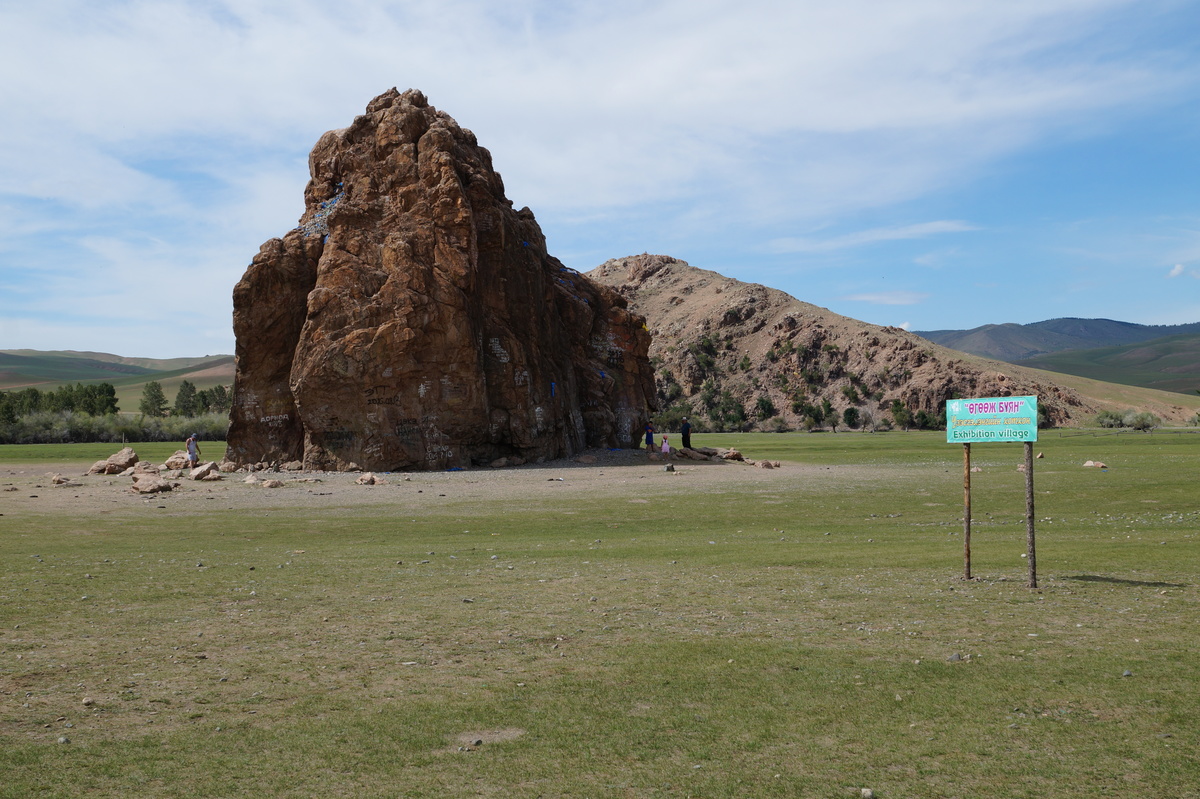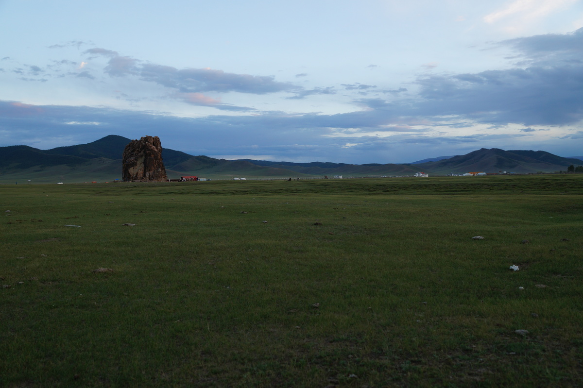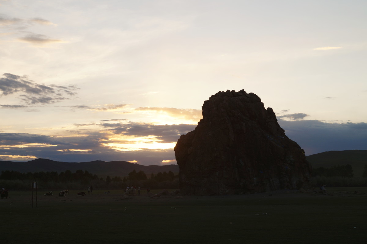 Taikhar Chuluu. Ein Stück weiter nach Nordwesten liegt der Felsen Taikhar Chuluu. Um den Felsen herum gibt es ein paar Stände, wir können dort sogar mit dem Bogen auf eine Scheibe schießen - ich verfehle sie nur knapp. Ein Spaziergang führt uns durch die Dämmerung am Abend.