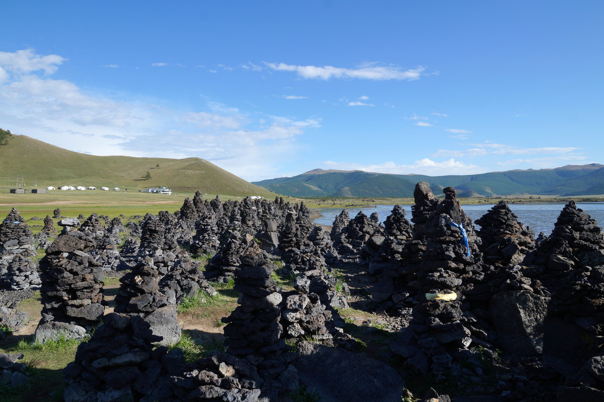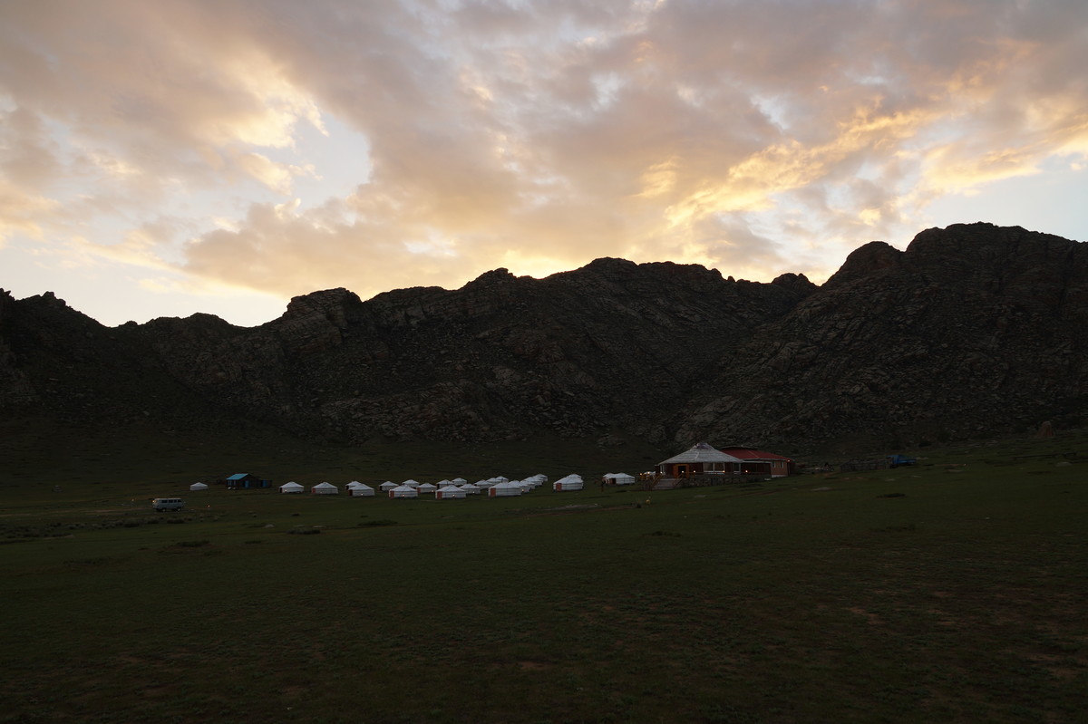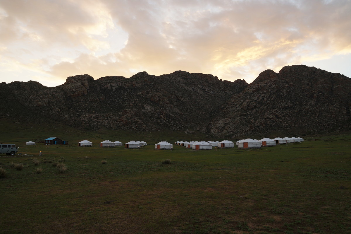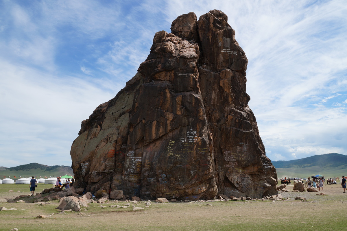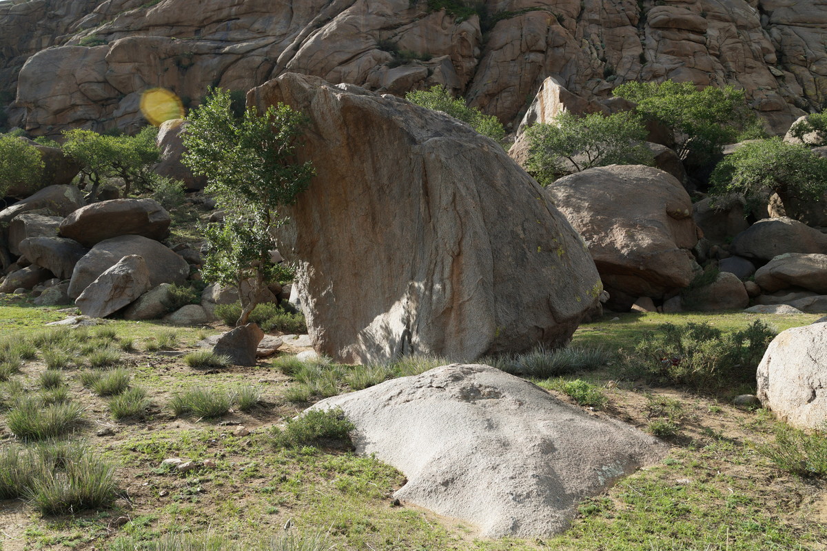 Taikhar Chuluu. Ein Stück weiter nach Nordwesten liegt der Felsen Taikhar Chuluu. Um den Felsen herum gibt es ein paar Stände, wir können dort sogar mit dem Bogen auf eine Scheibe schießen - ich verfehle sie nur knapp. Ein Spaziergang führt uns durch die Dämmerung am Abend.