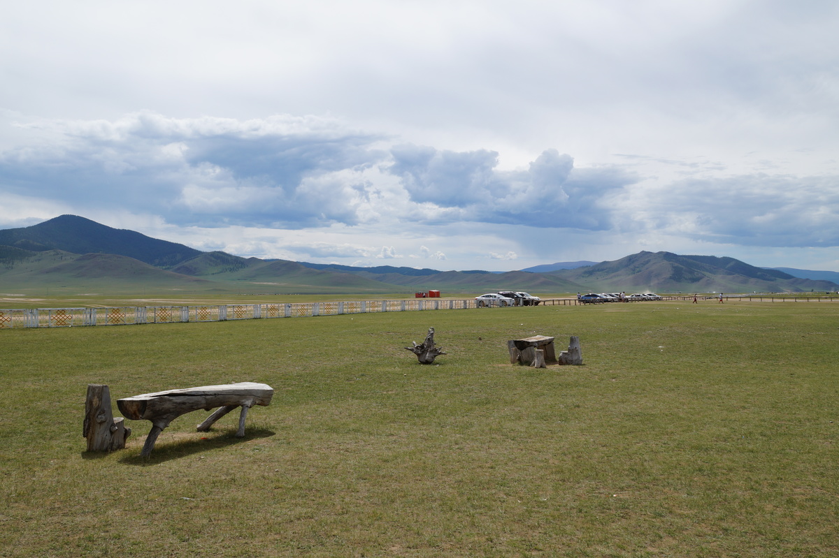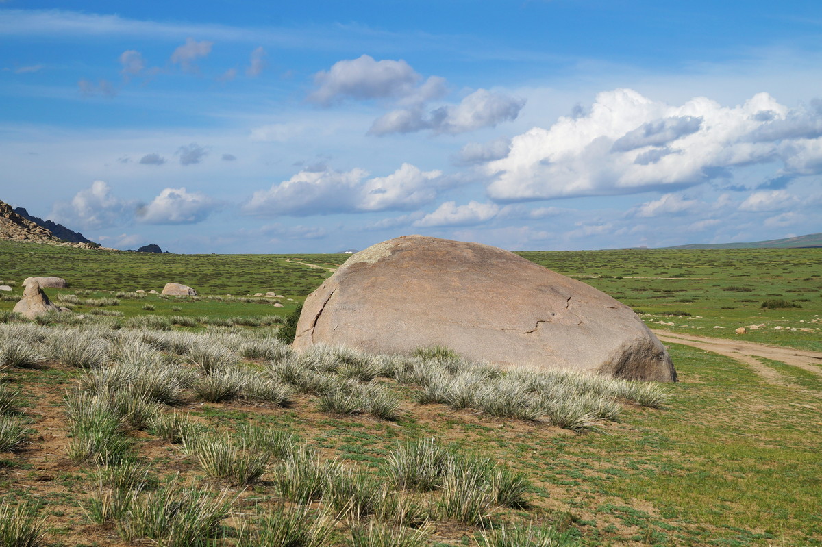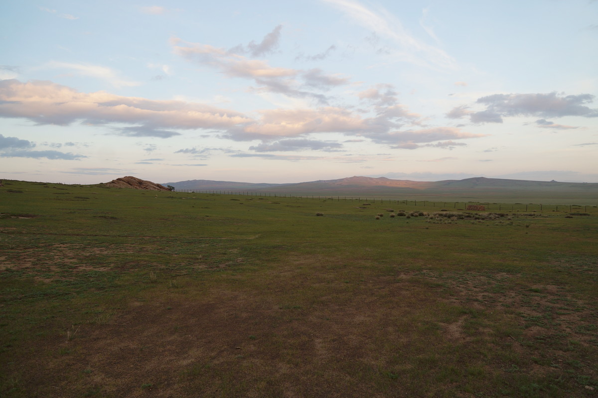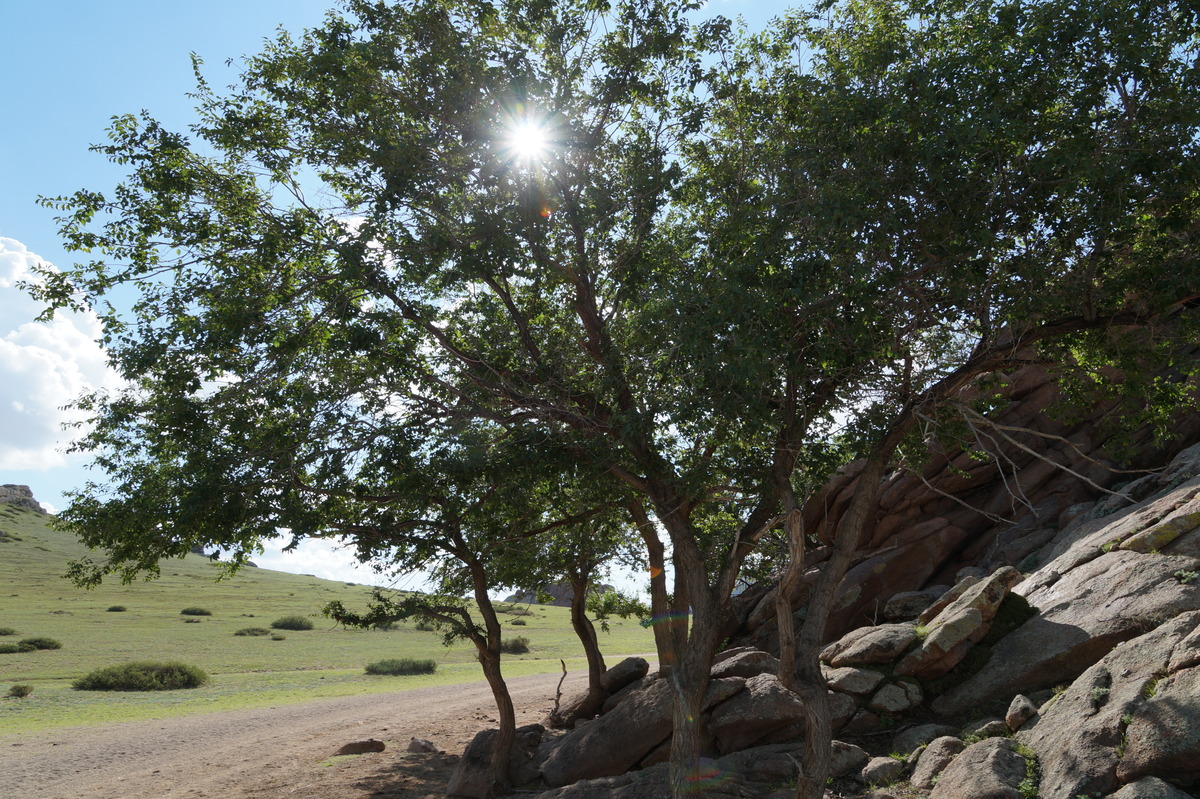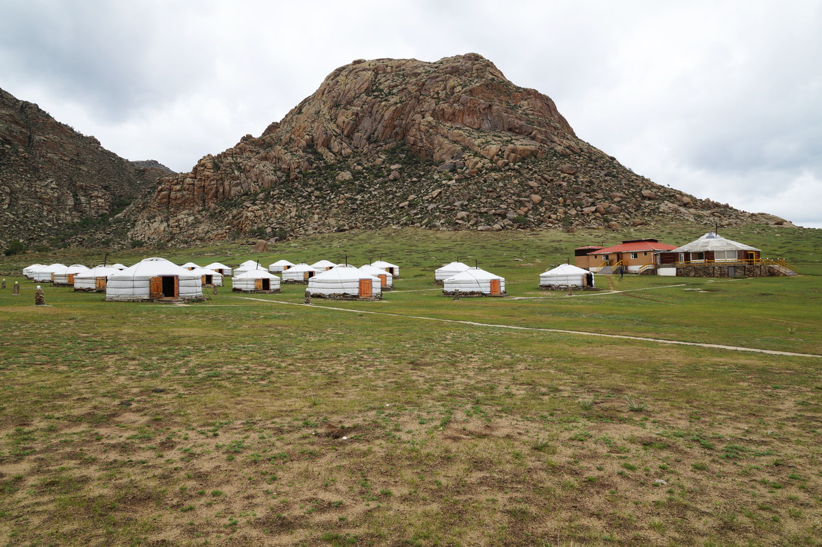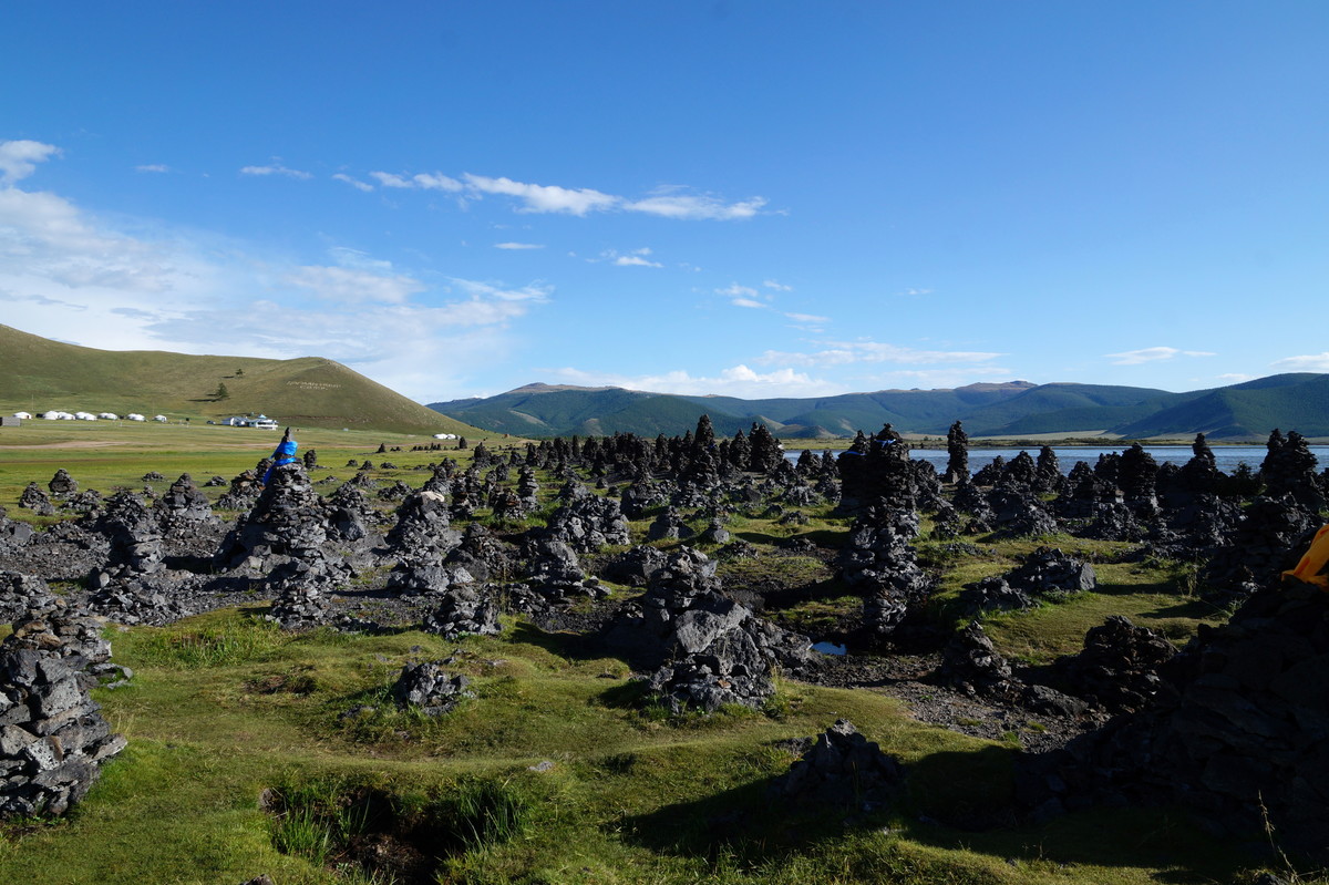 Taikhar Chuluu. Ein Stück weiter nach Nordwesten liegt der Felsen Taikhar Chuluu. Um den Felsen herum gibt es ein paar Stände, wir können dort sogar mit dem Bogen auf eine Scheibe schießen - ich verfehle sie nur knapp. Ein Spaziergang führt uns durch die Dämmerung am Abend.