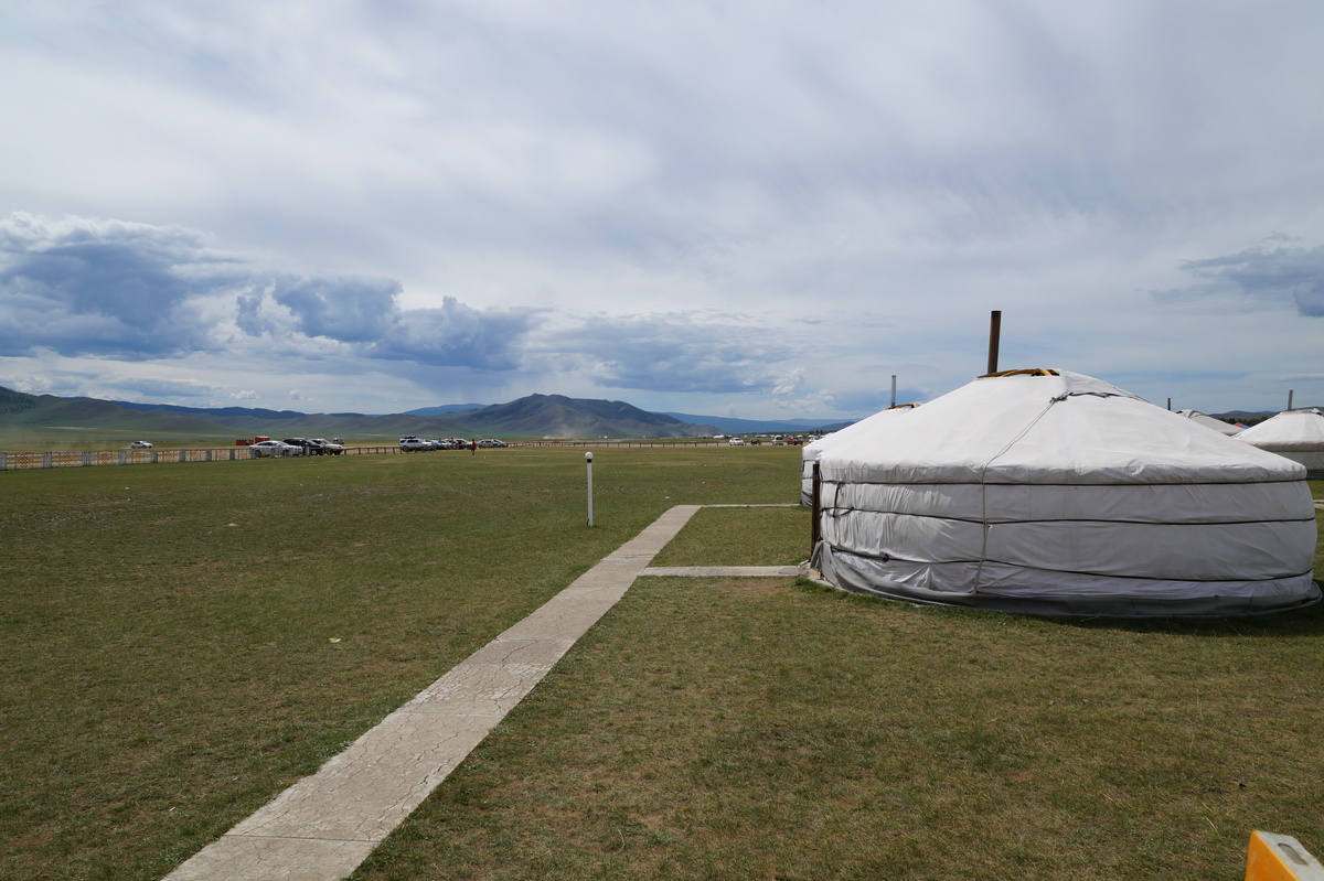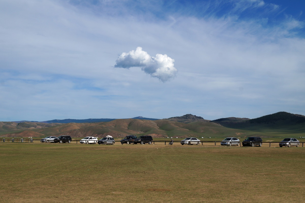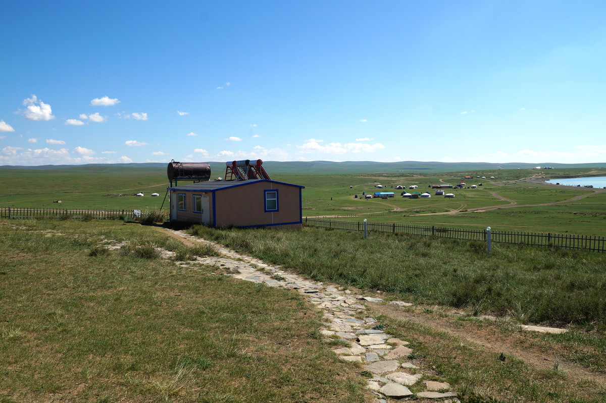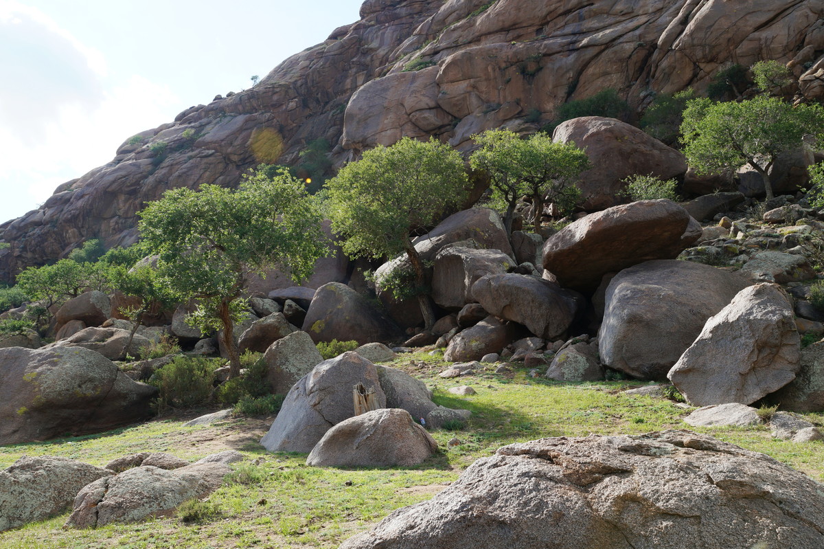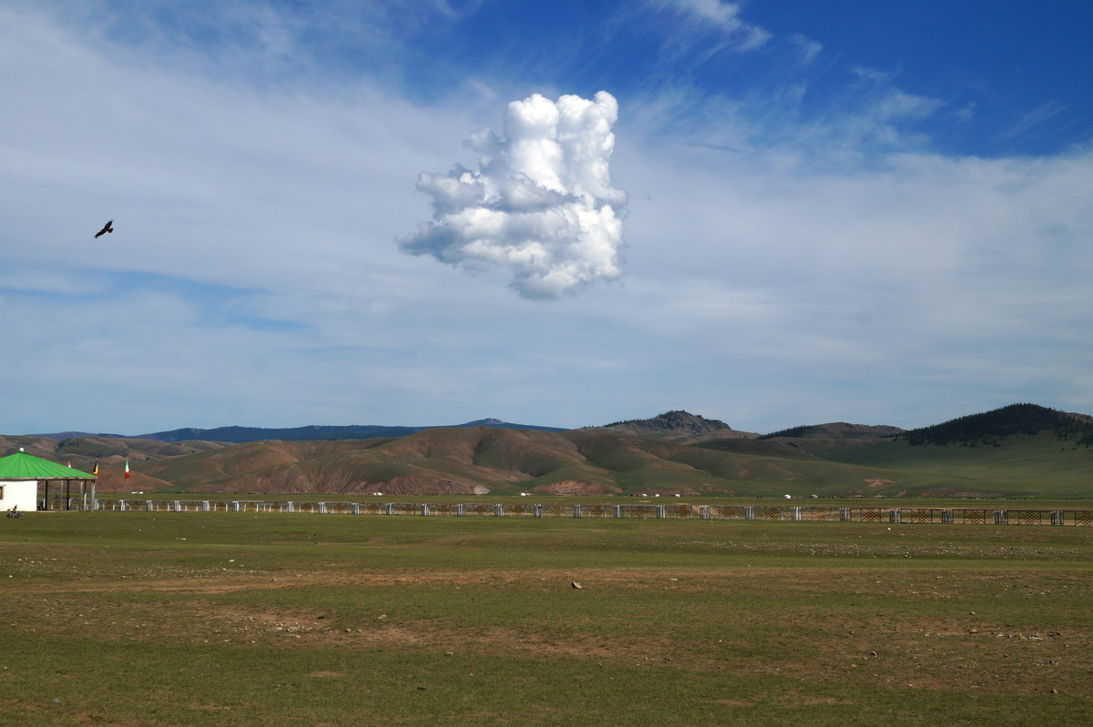Taikhar Chuluu. Ein Stück weiter nach Nordwesten liegt der Felsen Taikhar Chuluu. Um den Felsen herum gibt es ein paar Stände, wir können dort sogar mit dem Bogen auf eine Scheibe schießen - ich verfehle sie nur knapp. Ein Spaziergang führt uns durch die Dämmerung am Abend.