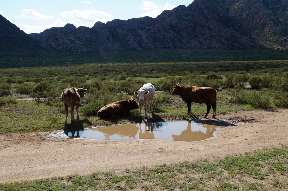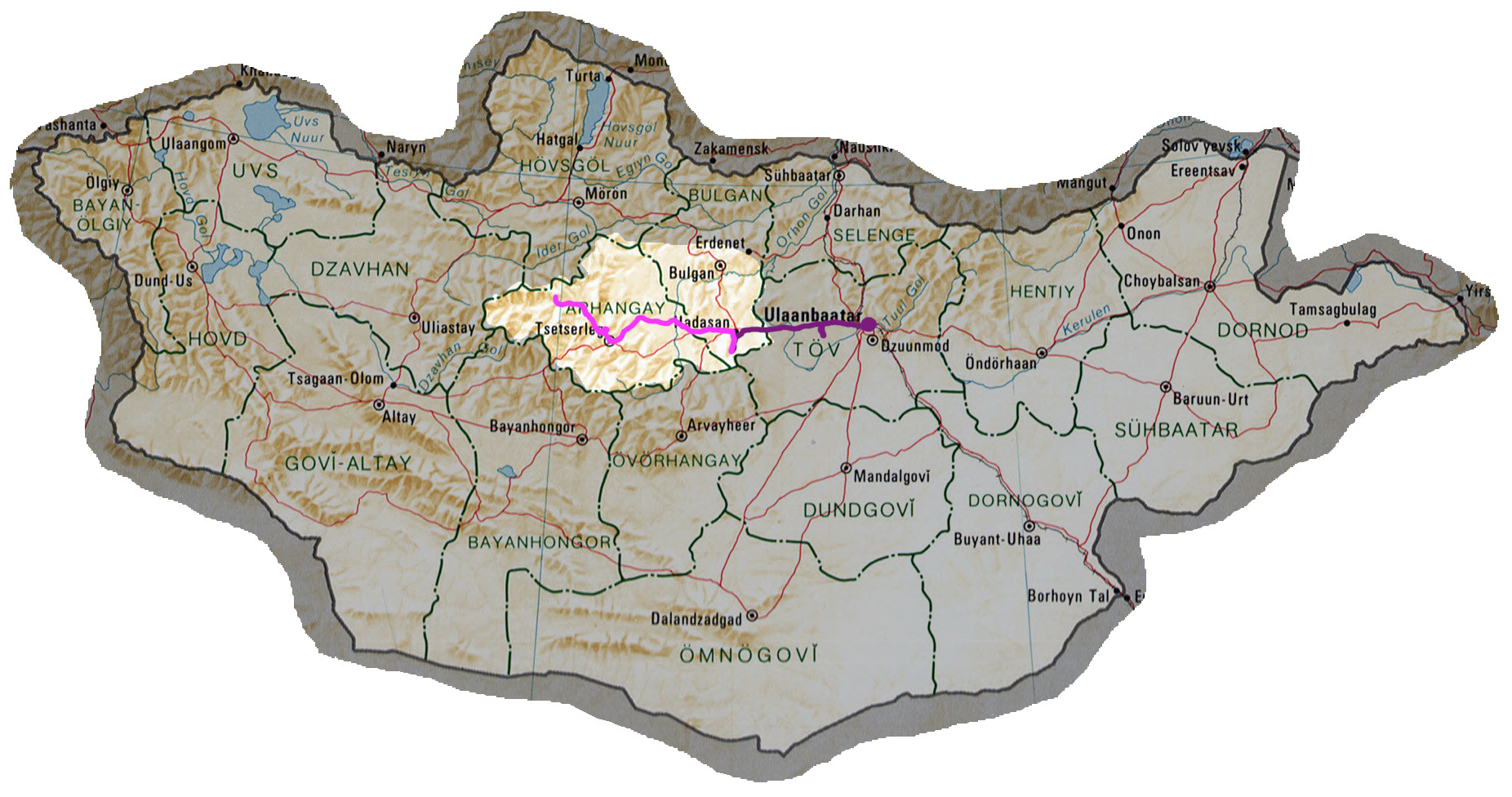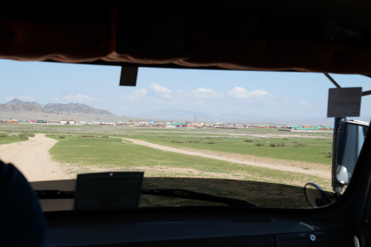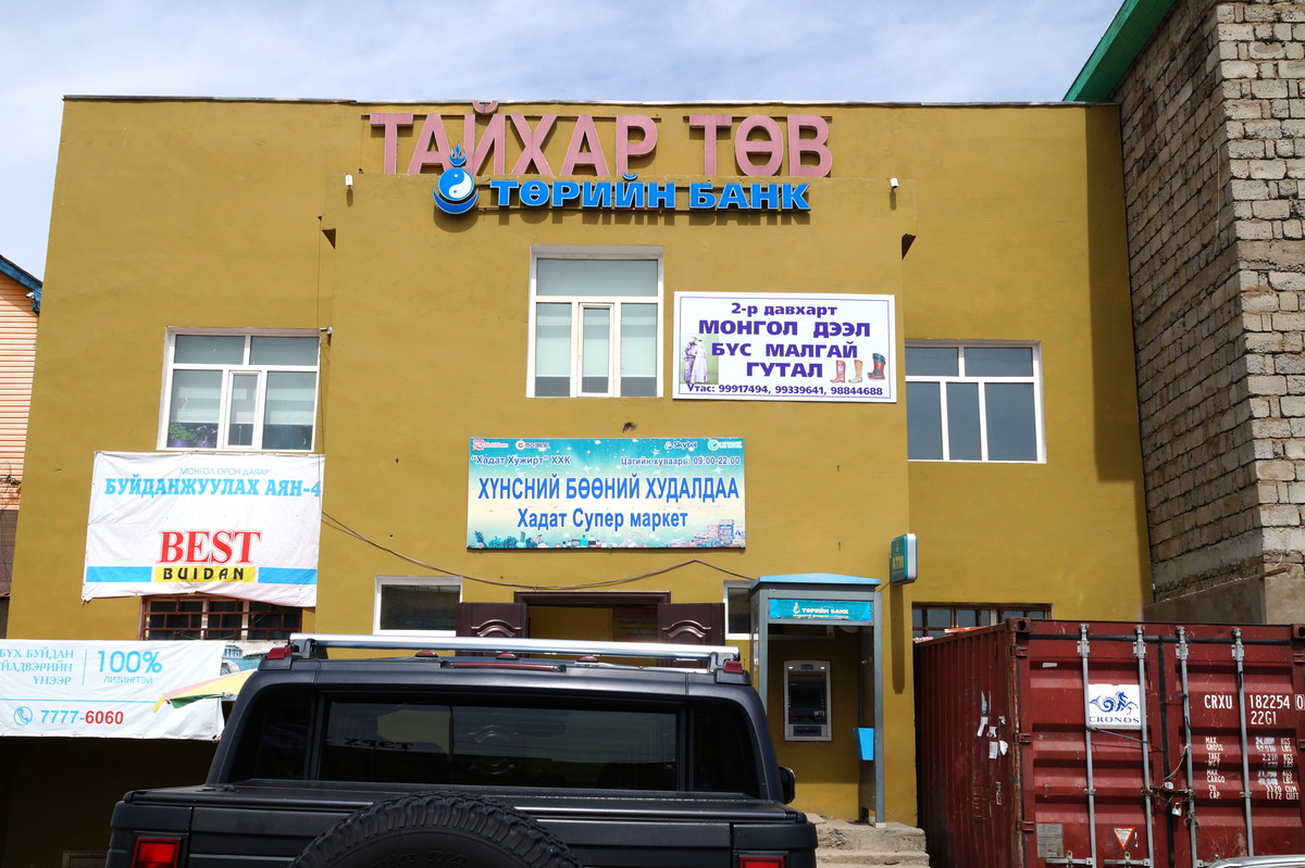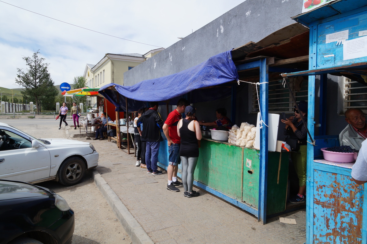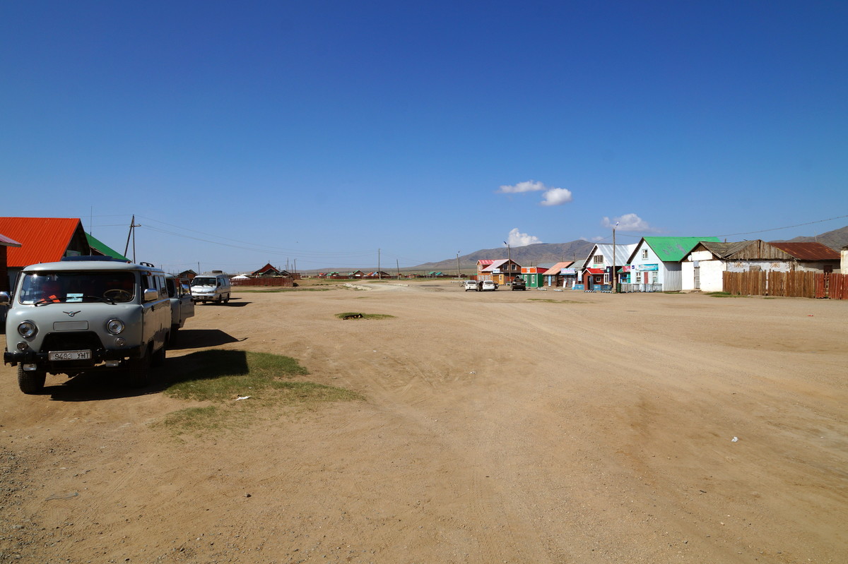 Tsetserleg. Wir brechen vormittags vom Ögii Nuur auf und machen einen Stopp in der Stadt Tsetserleg, der Hauptstadt des Aimags. Im Supermarkt gibt es viele vertraute Produkte (von "Gut und günstig", Edeka lässt grüßen); wir nutzen die Gelegenheit, ein paar Süßigkeiten für uns und für kommende Besuche bei Nomaden einzukaufen. Wir verlassen die Stadt bald wieder; wir kommen hier später noch einmal vorbei.