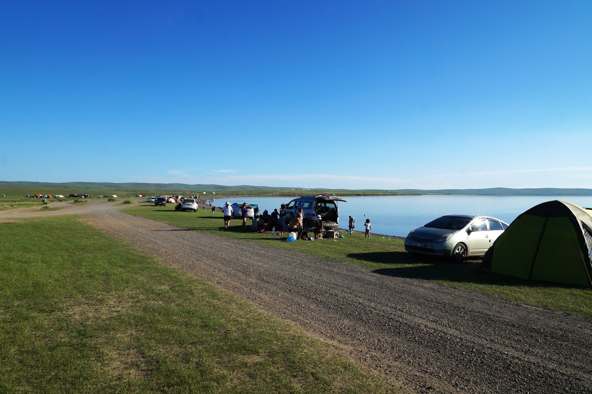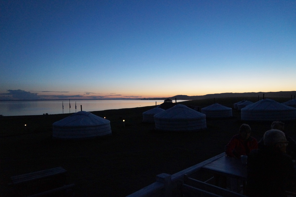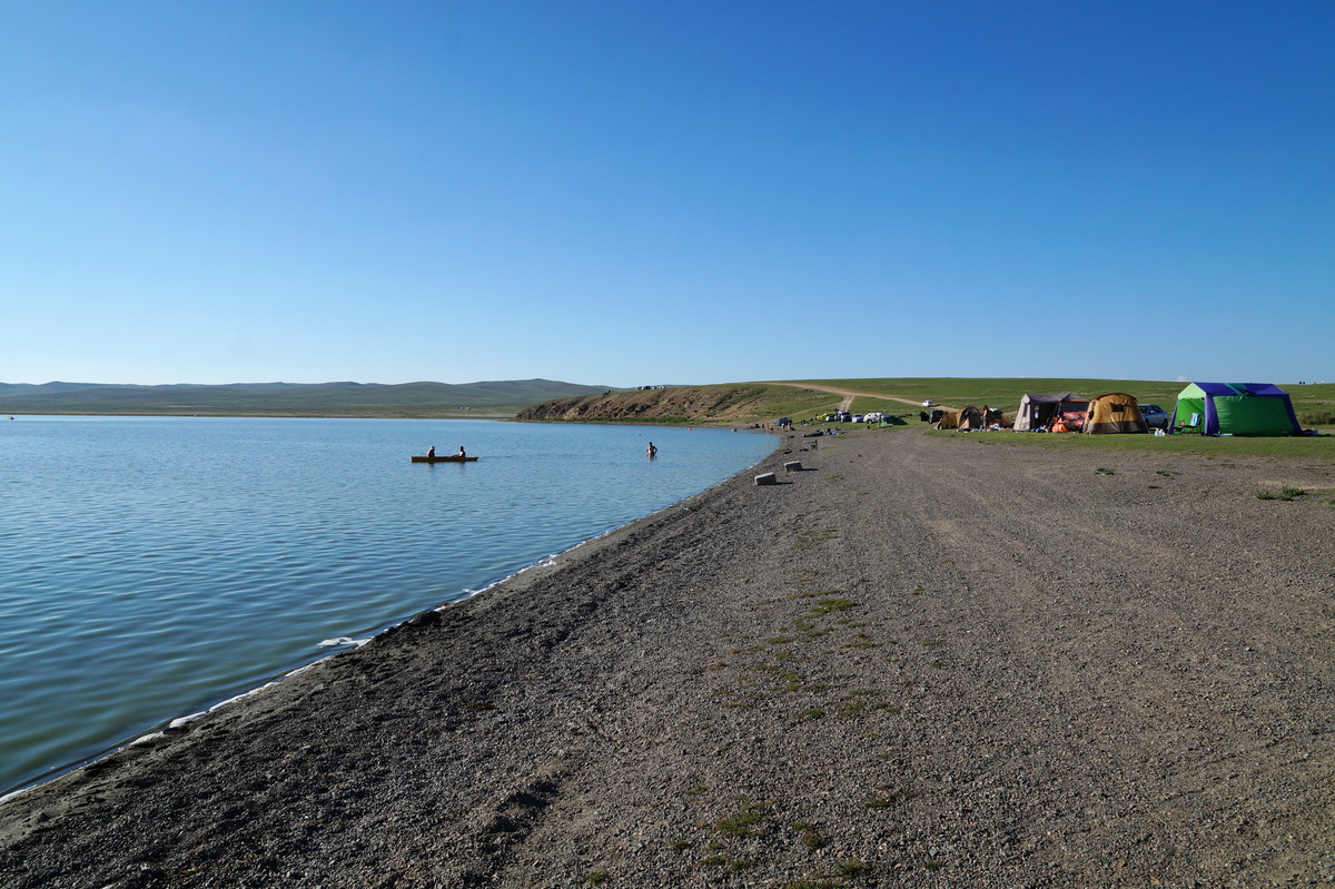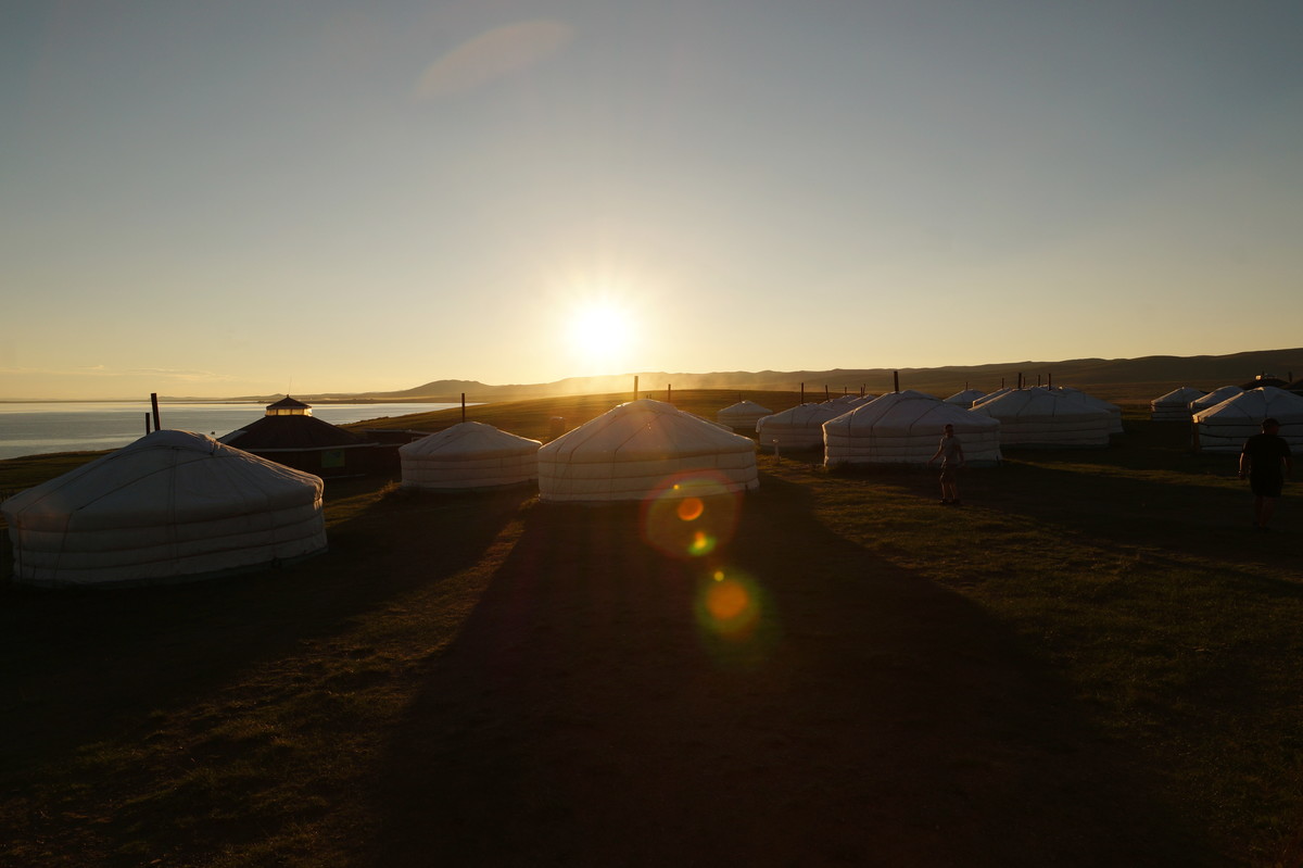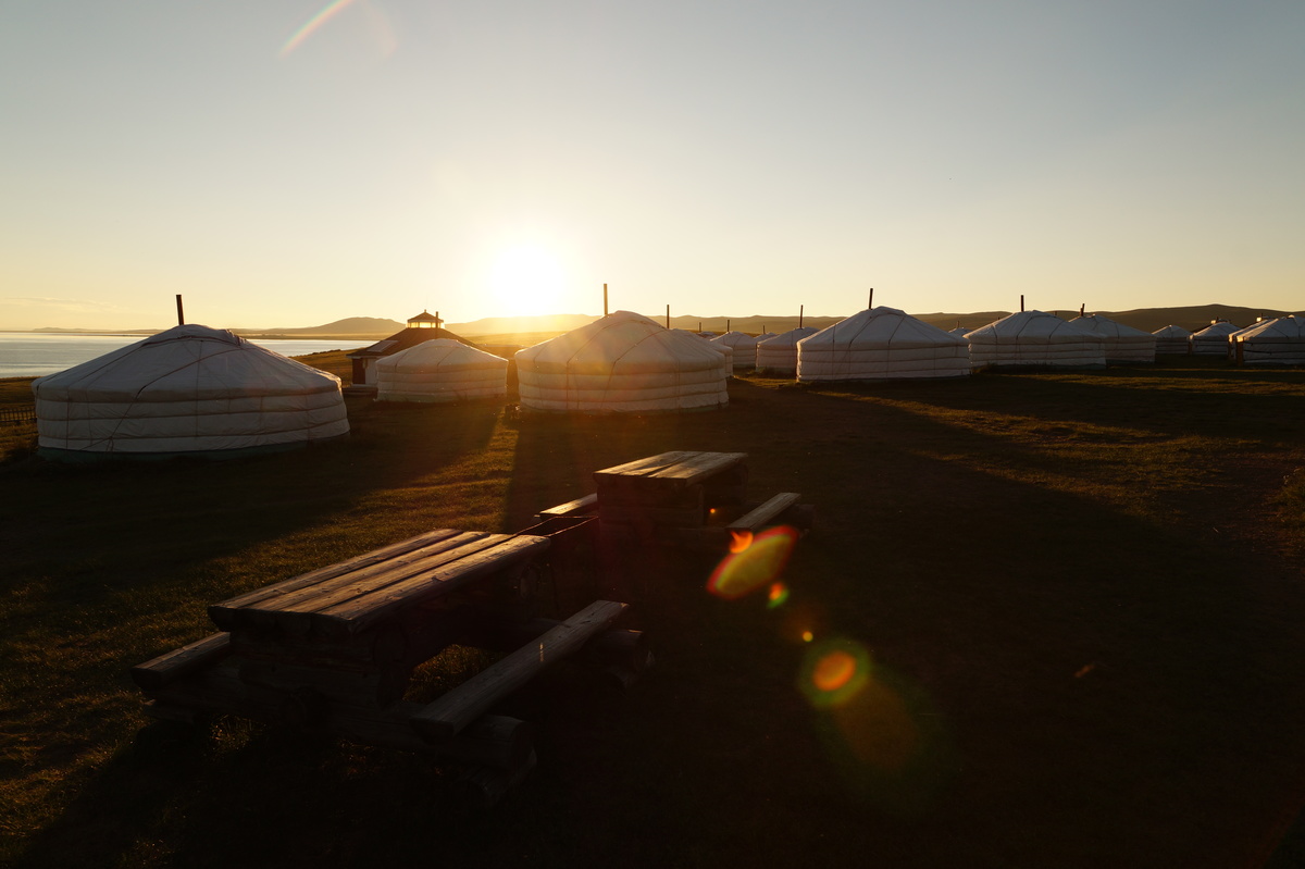 Ögii Nuur (Arkhangai). Weiter nach Westen geht es zu unserem nächsten Camp am Ögii Nuur. Vom Camp aus sieht man, wie sich der See vor einem erstreckt. Abends erleben wir den Sonnenuntergang über dem Camp.
