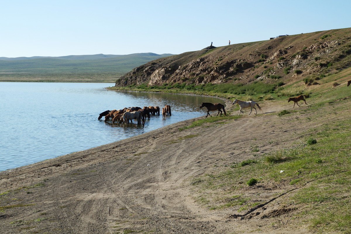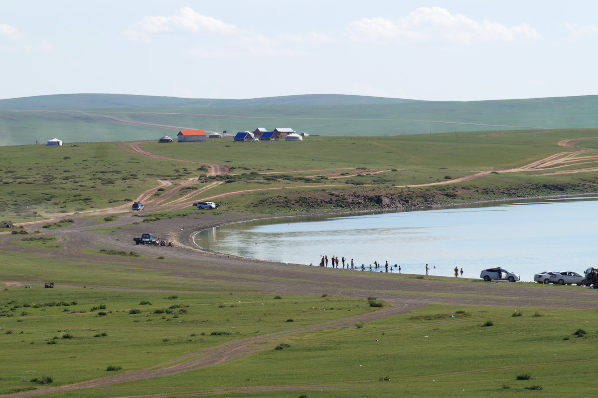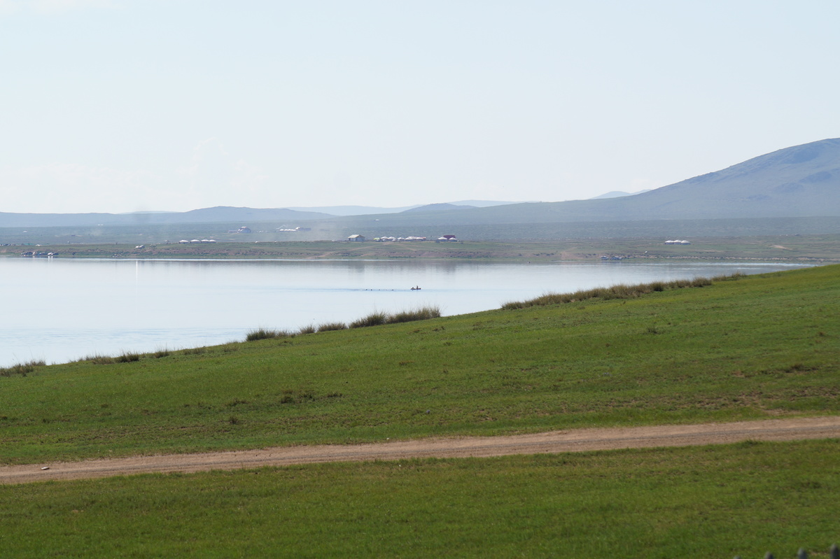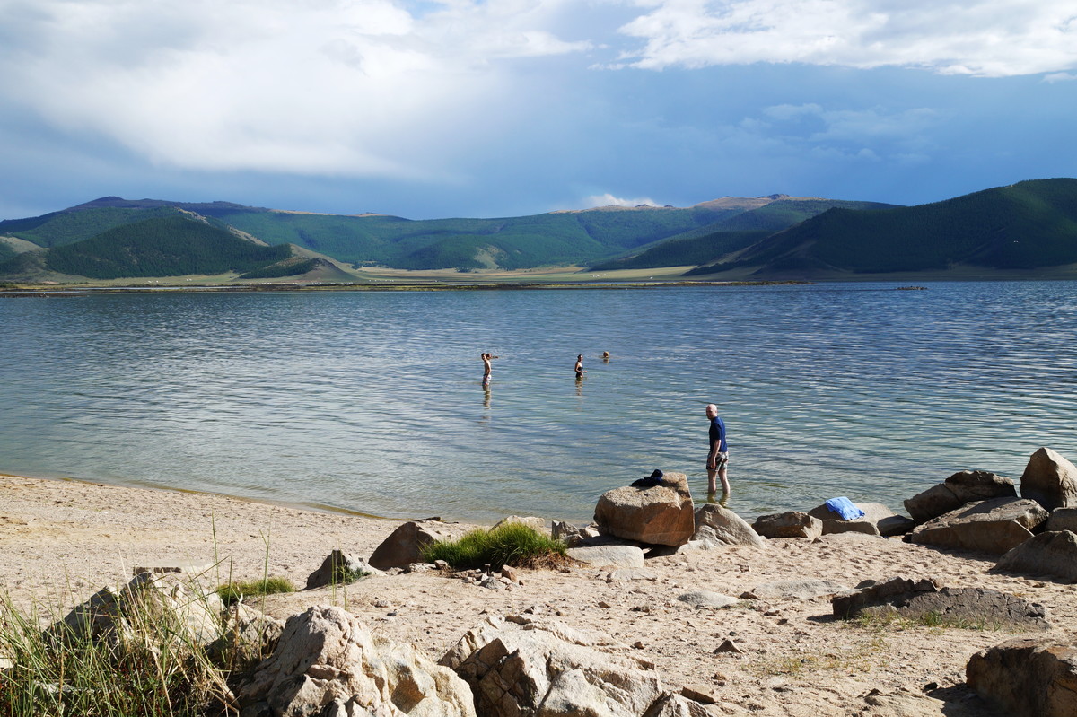 Nachmittags geht es zum See nebenan, dem Terkhiin Tsagaan Nuur. Leider erwartet uns kein kristallklares Wasser, sondern eine kräftiggrüne Brühe. Ich selbst verzichte lieber mal auf ein Bad.