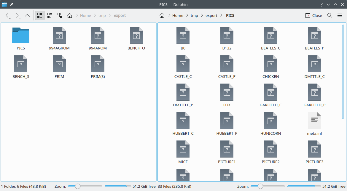 The screenshot on the right shows how the exported image looks like on the PC file system (Linux). The image that has been exported here is the one shown in the above screenshot of the saved floppy image. Two directories are visible here: In the left half you see the root directory of the floppy image; on the right you see the contents of the PICT subdirectory. That is, all contained directories are recursively exported. Since directories are not stored in special files, another file is created to keep the TI name of the directory (meta.inf).