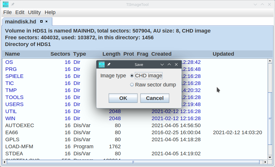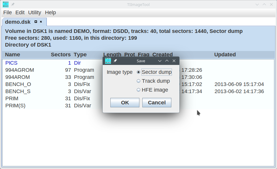 Floppy images can be saved as sector dumps (as known from the v9t9 emulator), track dumps (for PC99), or HFE images (for use with the Lotharek/GoTek floppy drive emulator).