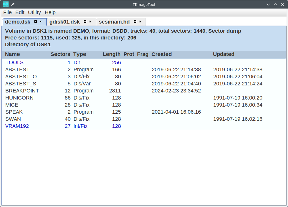 TIImageTool is a program which allows you to create and modify TI disk images in an intuitive way, including common file management features that we know from PC systems. Disk images can be created with different sizes, files can be copied from one disk to another, files can be imported and exported, and file systems can be checked for errors.