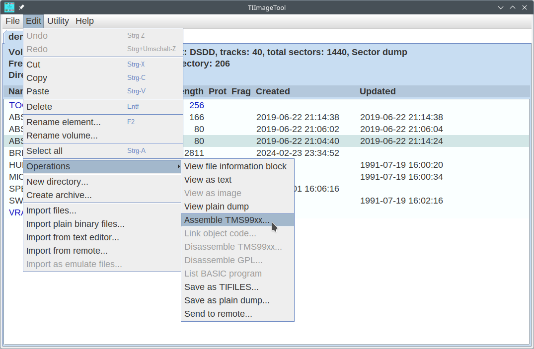 There are two kinds on menus in TIImageTool: the dropdown menus from the menu line, and the context menu. The selectable actions of the context menu depend on the file where the menu has been opened. Also, you can open a context menu below the file listing in order to operate on the volume itself, like for creating new files and directories.On the left you can see the context menu opened over the file ARCTEST_S. Possible actions are cutting / copying the file, renaming it, working with its content, sending/saving it, or archiving it. For instance, the screenshot shows that we are about to invoke the assembler (external tool) to create an object code file from this assembly source code file.