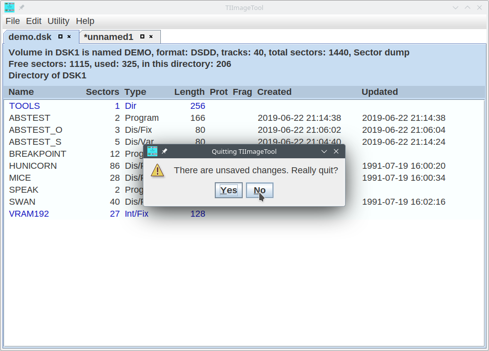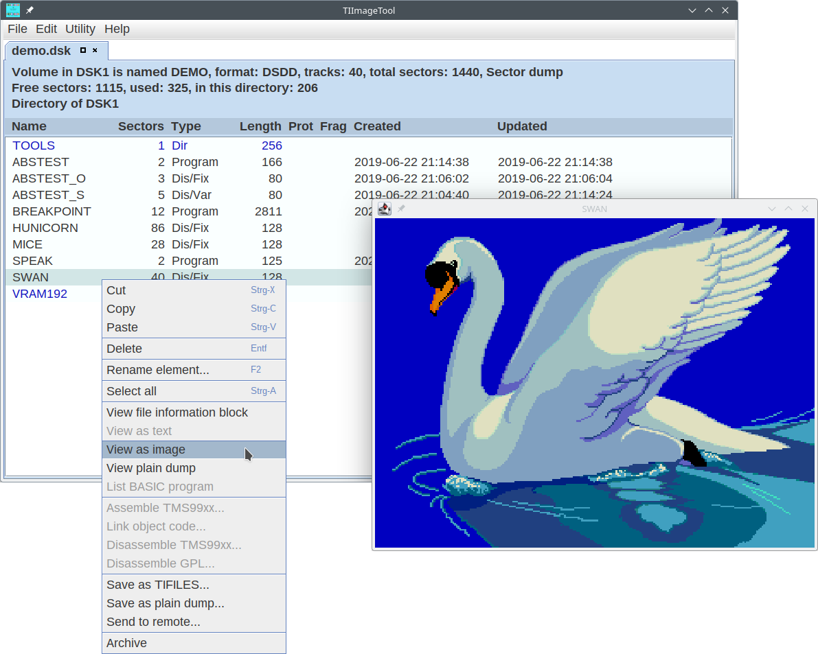 TIImageTool assumes a standard action for each file type, which is performed after double-clicking on the file. Text files are opened in a text editor; binary files are shown as a hexadecimal dump, images from painting programs are shown by a graphical output window. In some cases you may prefer another operation, e.g. viewing a picture file in a hexdump, or exporting a text file. Just choose the appropriate action in the context menu.Double-clicking on a directory enters that directory, and its contents are shown in the same view. Getting back in the file system tree is possible by double-clicking on ".." (two dots), representing the parent directory. Floppy disks may have up to three directories (beside the root directory which contains all elements); however, floppy subdirectories are only supported by Myarc floppy controller or the GeneveOS.