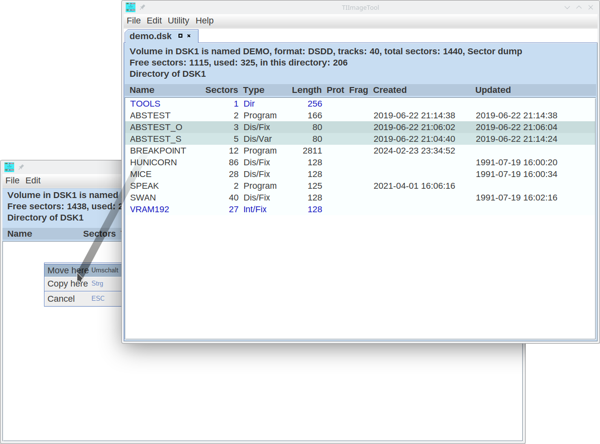When you drag your file outside of TIImageTool, over your desktop or in another folder on your PC drive, an export operation is done: The file will be saved to your PC as a TIFILES file. This is an external file format for TI files which makes it possible to import that file in another image or to use it with emulators like Classic99. Vice versa, you can drag a TIFILES file from your PC file system into a volume opened in TIImageTool. This will import the TIFILES file so that it can be used on the image further on.